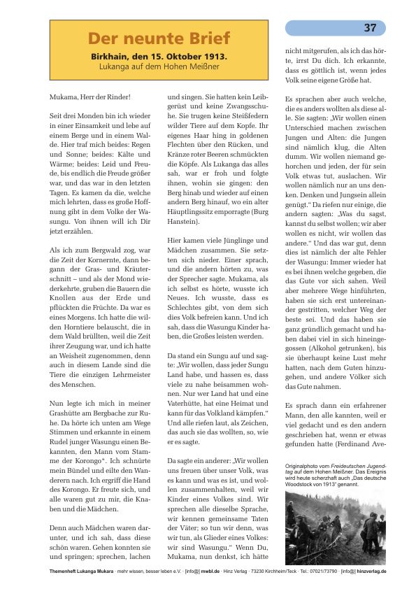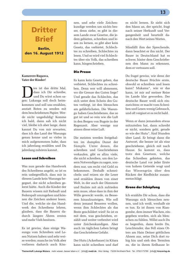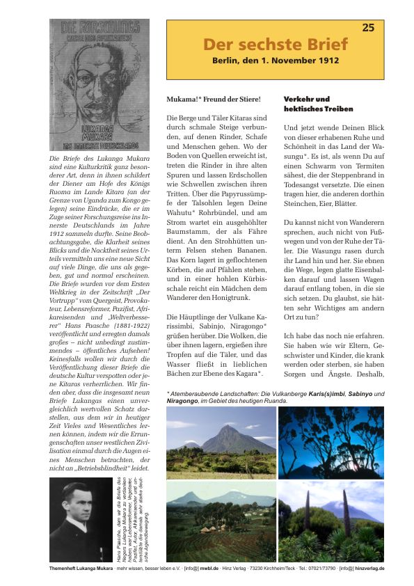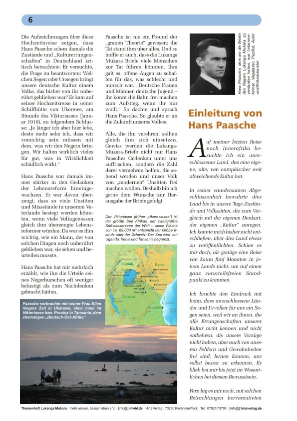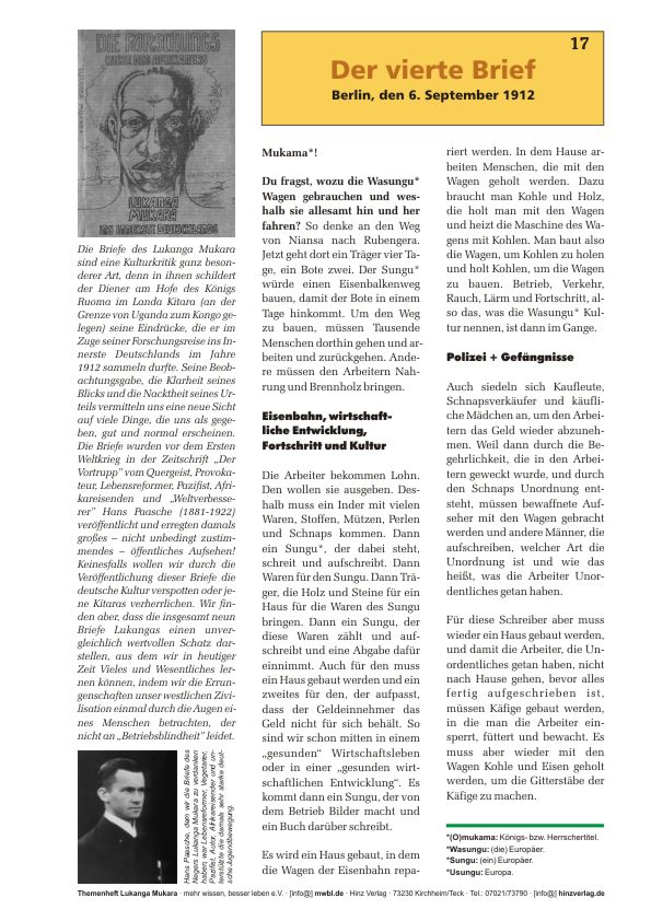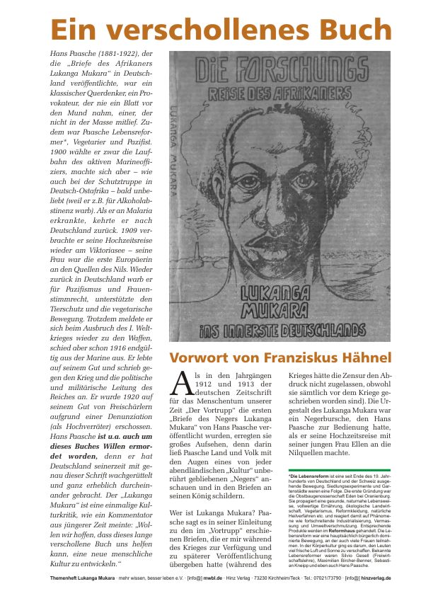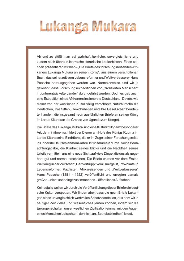 »Herzlich willkommen zu diesem Themenheft, in dem wir die „Briefe des Afrikaners Lukanga Mukara an seinen König im Lande Kitara“ wiedergeben. Dieselben stammen nicht wirklich von einem afrikanischen Naturburschen, sondern wurden Anfang des vorigen Jahrhunderts vom Lebensreformer Hans Paasche verfasst, einem ehemaligen Kolonialoffizier, der zum Pazifisten wurde. In seinem Werk schickte er den fiktiven Afrikaner nach Deutschland – von dort soll er seinem König Ruoma berichten, wie die „Wasungu“ (Deutschen) leben. Durch diesen Perspektivwechsel – ein Afrikaner beobachtet die Deutschen mit forschendem Blick – entlarvt Paasche die Absurditäten der deutschen Gesellschaft zu seiner Zeit. [...] Fazit: Hans Paasches Werk ist eine scharfsinnige Satire, welche die Absurditäten der deutschen Gesellschaft Anfang des 20. Jahrhunderts entlarvt. Durch den Perspektivwechsel und die humorvolle Darstellung regt das Buch zum Nachdenken über Kultur, Zivilisation und die eigenen Werte an. Auch heute noch hat das Werk nichts von seiner Aktualität verloren. Die Briefe des Lukanga Mukara bieten ein famoses Lesevergnügen! Genießen Sie sie! Ich wünsche Ihnen viel Freude dabei!«