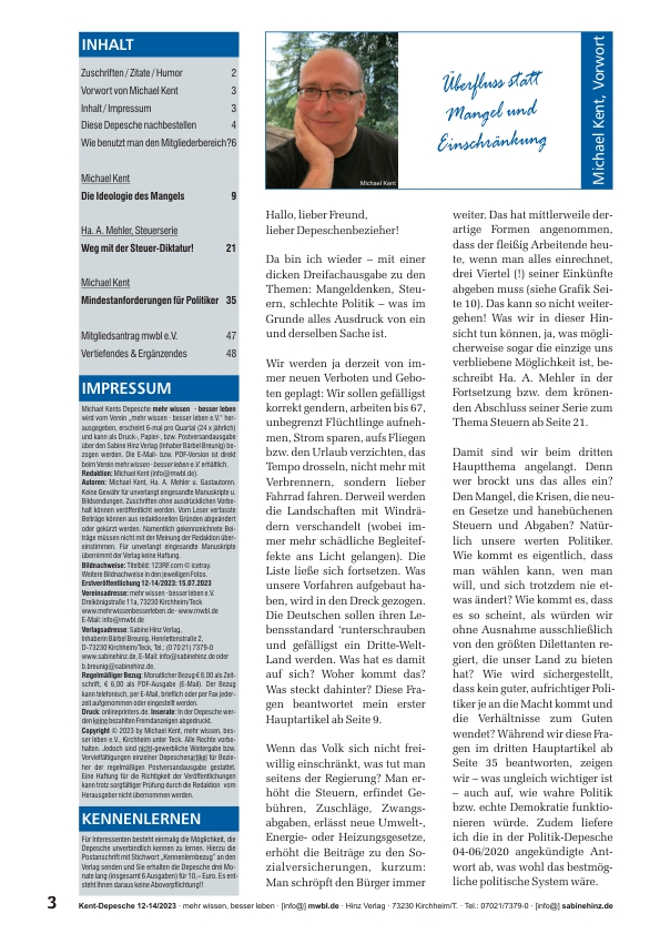 »Die heutige Politik versagt in Bausch und Bogen und hat jede Würde verloren. Kompetenz, Tugend, Aufrichtigkeit und Verantwortung sind Fremdwörter geworden. Das Parlament gleicht einem Affenhaus. Die einzig verbliebene Form des Dialogs scheint die gegenseitige Beschimpfung bzw. Beschuldigung zu sein. Die Parteien vertreten kaum mehr die Interessen der Bürger. [...] Neue Konkurrenzparteien, wie etwa die AfD, werden durch offizielle Verfassungsorgane schikaniert. Das alles ist weit von demokratischen und rechtsstaatlichen Prinzipien entfernt und nicht mit einem freiheitlichen System kompatibel. Im folgenden Artikel beantwortet Michael Kent die wichtigsten Fragen unserer Zeit: Wie könnte es besser gehen? Wie könnte wahre Demokratie verwirklicht werden? Und wie könnten erstmals die Besten der Besten an die Macht gelangen?«