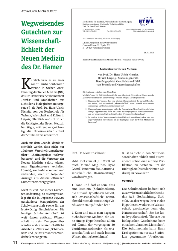 Auszüge aus dem wegweisendes Gutachten von Prof. Dr. Niemitz, das die Wissenschaftlichkeit und Richtigkeit der Neuen Medizin von Dr. Hamer bestätigt.