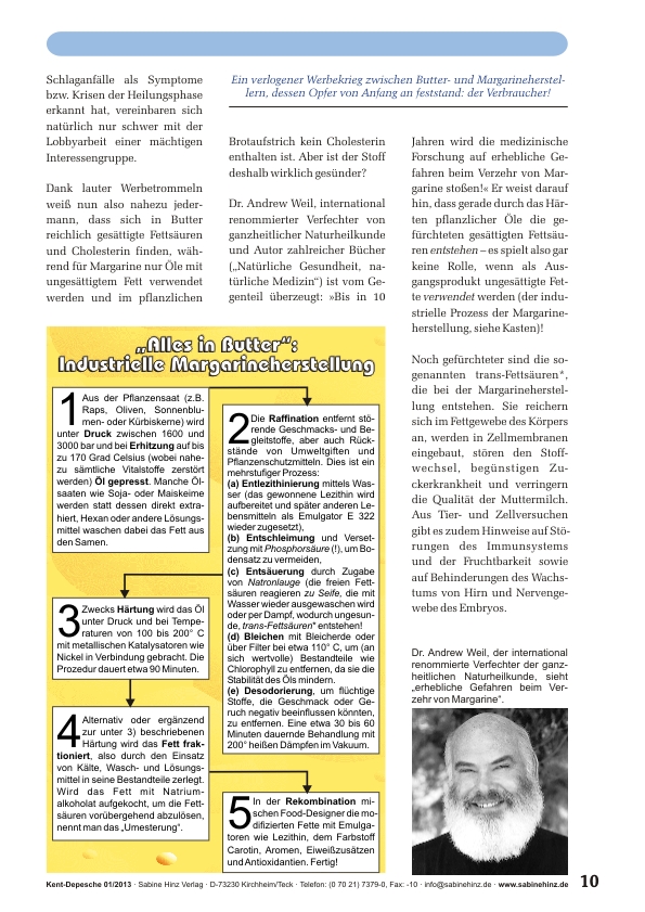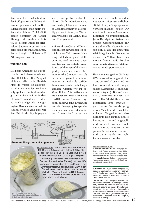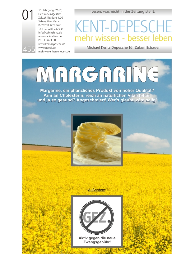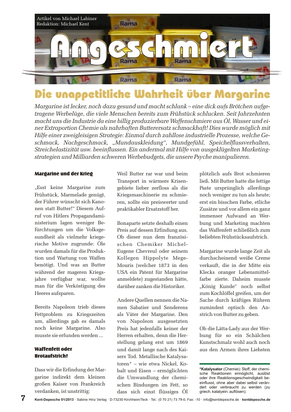 »Margarine ist lecker, noch dazu gesund und macht schlank – eine dick aufs Brötchen aufgetragene Werbelüge, die viele Menschen bereits zum Frühstück schlucken. Seit Jahrzehnten macht uns die Industrie da eine billig produzierbare Waffenschmiere aus Öl, Wasser und einer Extraportion Chemie als nahrhaften Butterersatz schmackhaft! Dies wurde möglich mit Hilfe einer zweigleisigen Strategie: Einmal durch zahllose industrielle Prozesse, welche Geschmack, Nachgeschmack, „Mundauskleidung“, Mundgefühl, Speichelflussverhalten, Streichelastizität usw. beeinflussen. Ein andermal mit Hilfe von ausgeklügelten Marketingstrategien und Milliarden schweren Werbebudgets, die unsere Psyche manipulieren.«