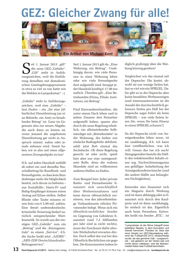 »Seit 1. Januar 2013 „gilt“ die neue GEZ-„Gebühr“. „Gilt“ steht in Anführungszeichen, weil die Einführung derselben mit demokratischen Gesetzgebungsprozessen in etwa so viel zu tun hatte wie die Wahlen in Lampukistan :-) „Gebühr“ steht in Anführungszeichen, weil eine „Gebühr“ – laut Duden – ein „für eine [öffentliche] Dienstleistung (an eine Behörde, ein Amt) zu bezahlender Betrag“ ist. Ganz im Gegensatz also zur neuen Abgabe, die auch dann zu leisten ist, wenn jemand die angebotene Dienstleistung gar nicht in Anspruch nimmt, nahm oder jemals nehmen wird.«