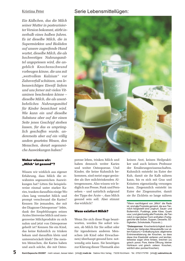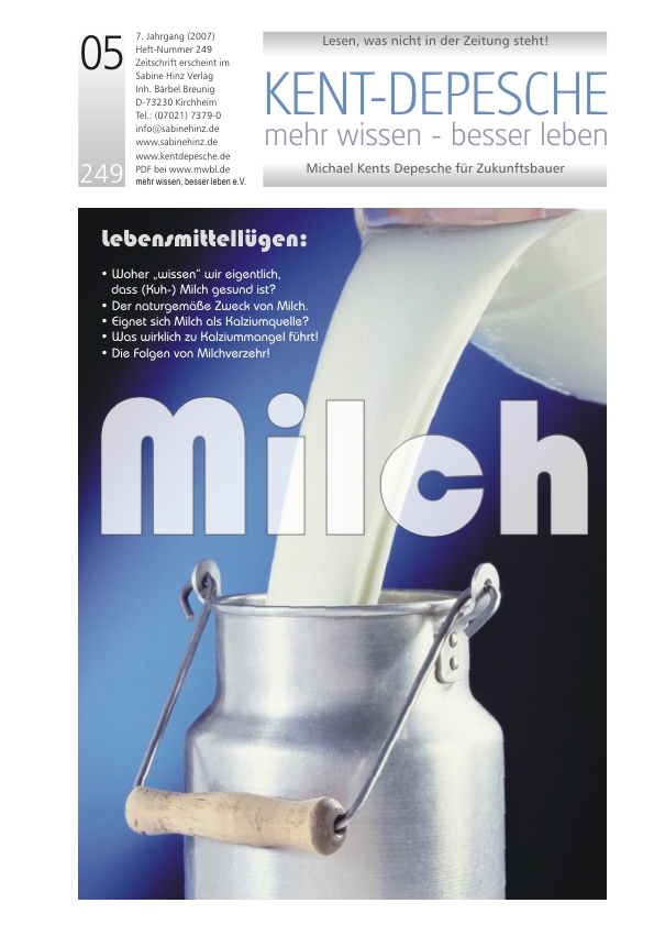 »Ein Kälbchen, das die Milch seiner Mutter in pasteurisierter Version bekommt, stirbt innerhalb eines halben Jahres. Es ist dieselbe Milch, die in Supermärkten und Bioläden auf unsere zugreifende Hand wartet, dieselbe Milch, die als hochwertiges Nahrungsmittel angepriesen wird, die angeblich Knochenschwund vorbeugen könne, die uns mit „wertvollem Kalzium“ vor Zahnverfall schützen, uns lebenswichtiges Eiweiß liefern und uns ferner mit vielen Vitaminen beschenken könne – dieselbe Milch, die als unentbehrliches Nahrungsmittel für Kinder bezeichnet wird. Wie kann ein und dieselbe Substanz aber auf der einen Seite jenes Geschöpf sterben lassen, für das es ursprünglich geschaffen wurde, andererseits aber auf ein völlig anders geartetes Wesen, den Menschen, derart segensreiche Auswirkungen haben?«