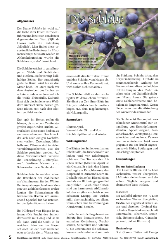 »Nachdem wir eine beträchtliche Pause eingelegt hatten, geht es nun weiter mit der Kräuterserie – heute mit der Schlehe! Wusstest Du beispielsweise, dass Pflaumen, Zwetschgen, Mirabellen allesamt Züchtungen aus der Schlehe sind? Noch mehr Interessantes, Anwendungen und Zubereitungen findest Du ab Seite 5.«