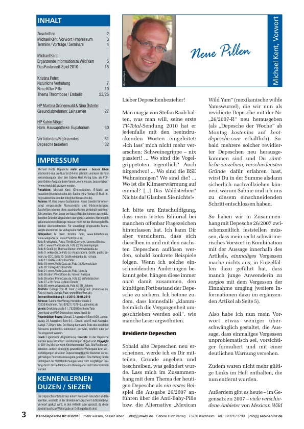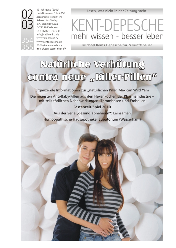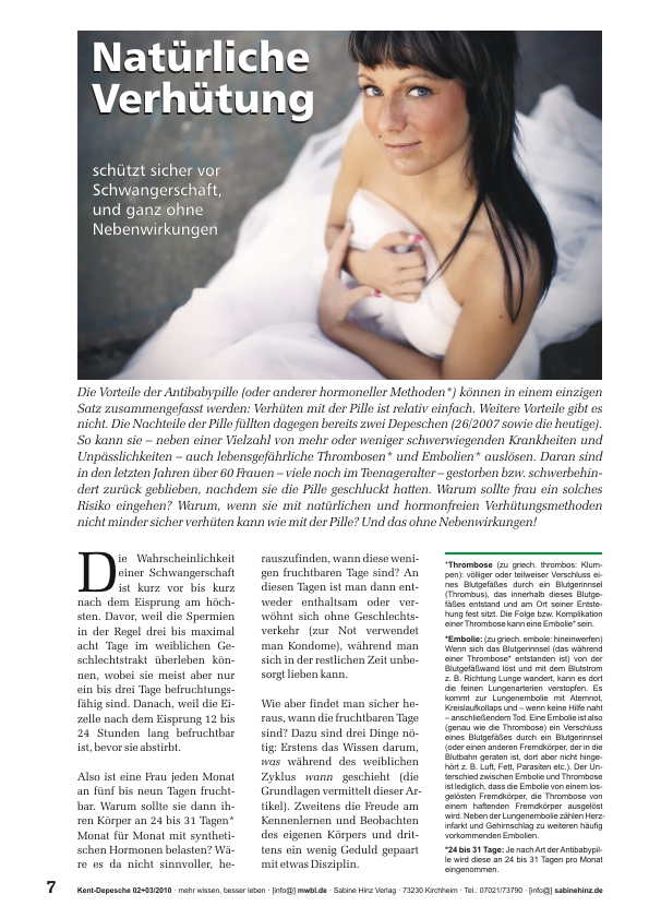 »Die Vorteile der Antibabypille (oder anderer hormoneller Methoden) können in einem einzigen Satz zusammengefasst werden: Verhüten mit der Pille ist relativ einfach. Weitere Vorteile gibt es nicht. Die Nachteile der Pille füllten dagegen bereits zwei Depeschen (26/2007 sowie die heutige). So kann sie – neben einer Vielzahl von mehr oder weniger schwerwiegenden Krankheiten und Unpässlichkeiten – auch lebensgefährliche Thrombosen und Embolien auslösen. Daran sind in den letzten Jahren über 60 Frauen – viele noch im Teenageralter – gestorben bzw. schwerbehindert zurück geblieben, nachdem sie die Pille geschluckt hatten. Warum sollte frau ein solches Risiko eingehen? Warum, wenn sie mit natürlichen und hormonfreien Verhütungsmethoden nicht minder sicher verhüten kann wie mit der Pille? Und das ohne Nebenwirkungen!«