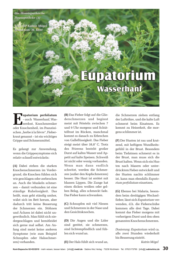 »Eupatorium perfoliatum – auch Wasserhanf, Wasserdost, Knochenrenker oder Knochenheil, im Französischen „herbe à la fièvre“, Fieberkraut genannt – ist ein wichtiges Grippe und Schmerzmittel.Es gelangt zur Anwendung, wenn die Grippesymptome sich relativ schnell entwickeln.«
