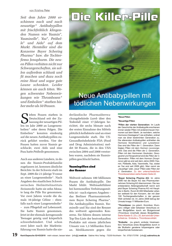 »Seit dem Jahre 2000 erschienen nach und nach neuartige* Antibabypillen mit frischfröhlich klingenden Namen wie Yasmin®, Yasminelle®, Yaz®, Petibelle® und Aida® auf dem Markt. Hersteller sind die Konzerne Bayer Schering Pharma bzw. die Tochterfirma Jenapharm. Die neuen Pillen verhüten nicht nur Schwangerschaften, sie sollen außerdem schlank und fit machen und dazu noch reine Haut und sogar gute Laune schenken. Leider können sie auch töten. Wegen schwerster Nebenwirkungen wie Thrombosen und Embolien starben bisher mehr als 50 Frauen.«