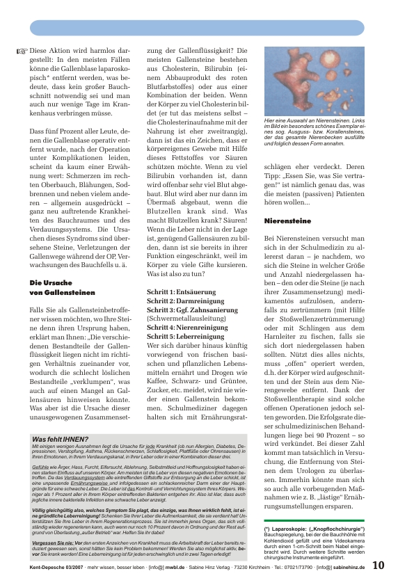 »Rund 15 Prozent aller Männer und 10 Prozent aller Frauen „dürfen” im Laufe ihres Lebens mit dem Auftreten von Nierensteinen rechnen. Gallensteine erfreuen sich einer noch größeren Beliebtheit: Ein Drittel aller Frauen und ein Fünftel aller Männer über 40 Jahre haben gemäß aktueller Statistiken Gallen-steine. Die wirkliche Ursache der Steinentstehung ist der Schulmedizin noch ein Rätsel. Dennoch beansprucht sie für sich das alleinige Behandlungsrecht. Alle anderen, weitaus günstigeren und für den Patienten angenehmeren Methoden werden als „ungeeignete Hausmittel“ bezeichnet. Nichtsdestotrotz wächst die Zahl derer, die ihre Gesundheit gerne in die eigenen Hände nehmen und einfache Methoden anwenden, die laut zahlreicher Betroffener zu Steinfreiheit führten – ohne Anästhesie (Betäubung), ohne Krankenhausaufenthalt, ohne Medikamente, ohne Organverlust und ohne vierstellige Operationskosten: Mit Hilfe der Nierenreinigung nach Dr. Hulda Clark sowie der traditionellen Leberreinigung!«