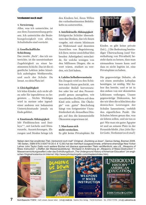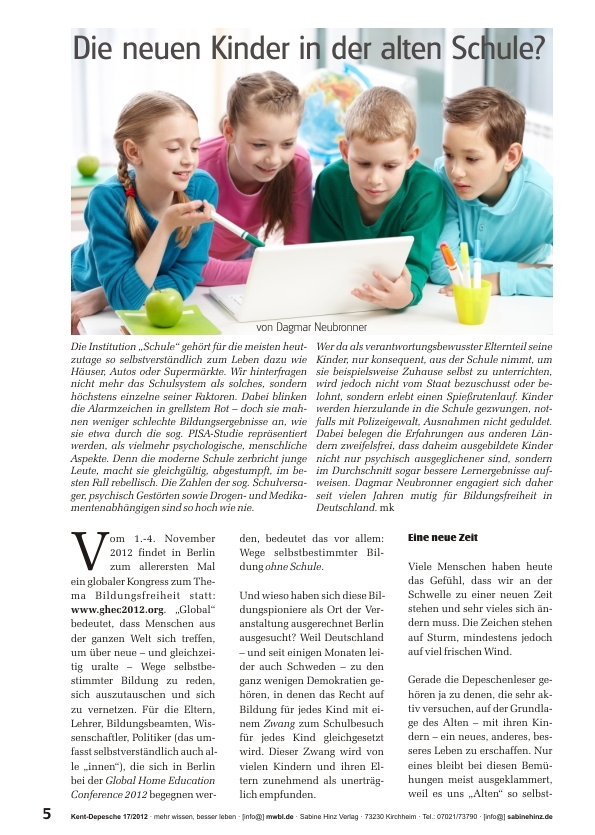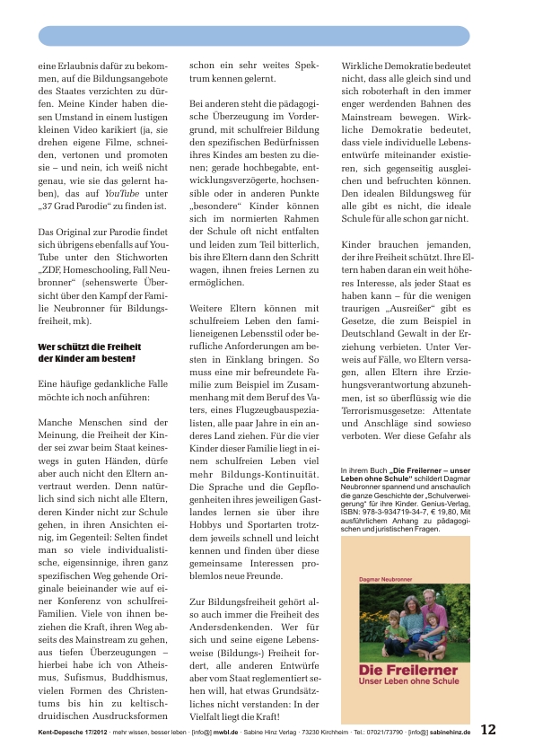 »Die Institution Schule gehört für die meisten heutzutage so selbstverständlich zum Leben dazu wie Häuser, Autos oder Supermärkte. Wir hinterfragen nicht mehr das Schulsystem als solches, sondern höchstens einzelne seiner Faktoren. Dabei blinken die Alarmzeichen in grellstem Rot – doch sie mahnen weniger schlechte Bildungsergebnisse an, als vielmehr psychologische, menschliche Aspekte. Denn die moderne Schule zerbricht junge Leute, macht sie gleichgültig, abgestumpft, im besten Fall rebellisch. Die Zahlen der sog. Schulversager, psychisch Gestörten sowie Drogen- und Medikamentenabhängigen sind hoch. Wer da als verantwortungsbewusster Elternteil seine Kinder aus der Schule nimmt, um sie Zuhause selbst zu unterrichten, wird jedoch nicht vom Staat bezuschusst oder belohnt, sondern erlebt einen Spießrutenlauf. Kinder werden hierzulande in die Schule gezwungen, notfalls mit Polizeigewalt, Ausnahmen nicht geduldet. Dabei belegen die Erfahrungen aus anderen Ländern, dass daheim ausgebildete Kinder nicht nur psychisch ausgeglichener sind, sondern im Durchschnitt sogar bessere Lernergebnisse aufweisen. Dagmar Neubronner engagiert sich daher seit vielen Jahren mutig für Bildungsfreiheit in Deutschland.«