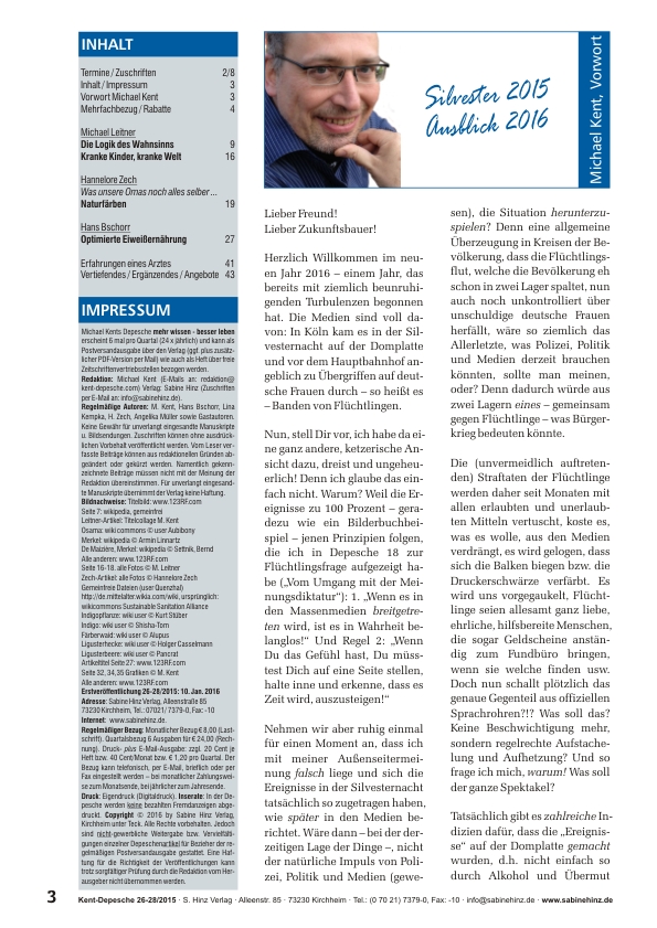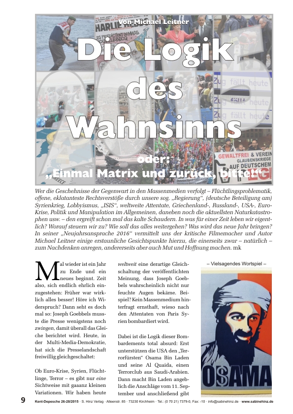 »Wer die gegenwärtigen Geschehnisse in den Medien verfolgt – Flüchtlingsproblematik, eklatanteste Rechtsverstöße durch die Regierung, (deutsche Beteiligung am) Syrienkrieg, Lobbyismus, weltweite Attentate, Griechenland-, Russland-, USA-, Euro-Krise usw. – den ergreift schon mal das kalte Schaudern. In was für einer Zeit leben wir eigentlich? Wie soll das alles weitergehen? Was wird das neue Jahr bringen? In seiner „Neujahrsansprache 2016“ vermittelt uns der kritische Filmemacher und Autor Michael Leitner einige erstaunliche Gesichtspunkte, die einerseits zwar – natürlich – zum Nachdenken anregen, andererseits aber auch Mut und Hoffnung machen.«