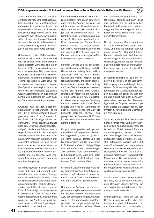 • Erfahrungen eines Arztes: Schulmedizin versus Germanische Neue Medizin/Heilkunde (Dr. Hamer)