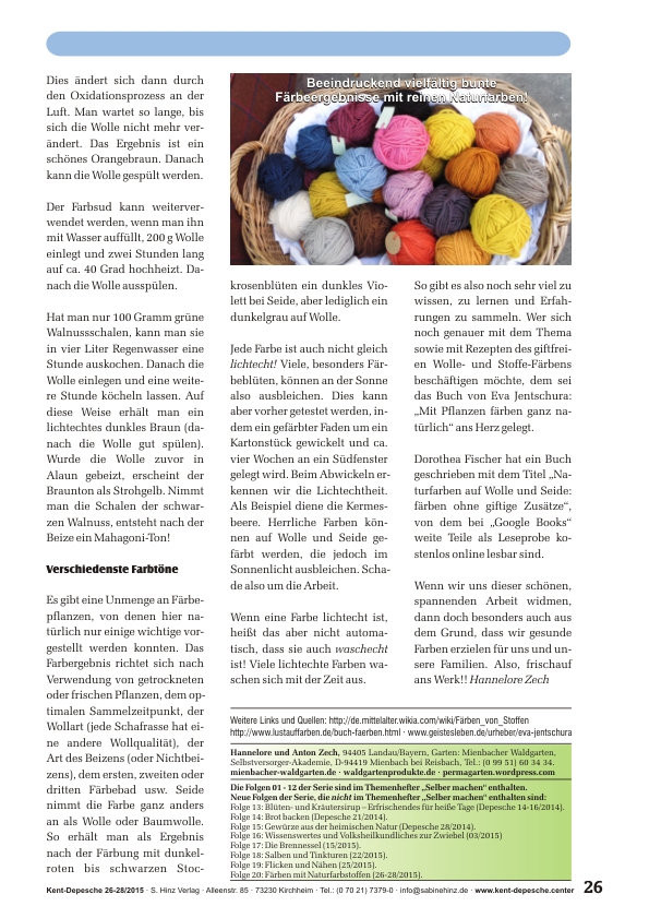 »Das Färben von Stoffen hat lange Tradition, wobei Färber einst eine eigene Handwerkszunft bildeten – es gab damals „Schlichtfärber“ für die einfachen Farbtöne und die „Schönfärber“ für feinere Waren in edlen Farben sowie die Seidenfärber. Bereits im alten Ägypten waren die Färbetechniken ausgereift. Wolle und Stoffe mit Pflanzen, Pflanzenbestandteilen, Rinden usw. zu färben, ist auch heute noch etwas Besonderes. Man geht intensiv mit dem Werkstoff um, bekommt eine besondere Beziehung zu ihm. Heutzutage, wo chemische Farbstoffe allzeit billig erhältlich sind, braucht es besondere Liebe zur Natur, Hingabe und Geduld, wenn man die Färberpflanzen selber sammeln und Wolle/Stoffe selbst färben möchte. Wer sich dem aber hingibt, wird belohnt – durch einmalige und individuelle Naturfarben und durch das gute Gefühl, natürliche Kleidung zu tragen, die garantiert frei von Kinderarbeit und Ausbeutung sowie von neumodischen chemischen Giften und Allergenen ist.«