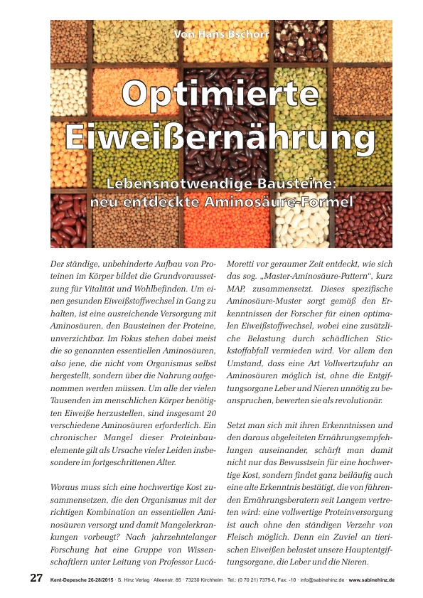 »Der unbehinderte Aufbau von Proteinen im Körper bildet die Grundvoraussetzung für Vitalität und Wohlbefinden. Um einen gesunden Eiweißstoffwechsel in Gang zu halten, ist eine ausreichende Versorgung mit Aminosäuren, den Bausteinen der Proteine, unverzichtbar. Im Fokus stehen dabei meist die so genannten essentiellen Aminosäuren, also jene, die nicht vom Organismus selbst hergestellt, sondern über die Nahrung aufgenommen werden müssen. Um alle der vielen Tausenden im menschlichen Körper benötigten Eiweiße herzustellen, sind insgesamt 20 verschiedene Aminosäuren erforderlich. Ein chronischer Mangel dieser Proteinbau-Elemente gilt als Ursache vieler Leiden insbesondere im fortgeschrittenen Alter. Woraus muss sich eine hochwertige Kost zusammensetzen, die den Organismus mit der richtigen Kombination an essentiellen Aminosäuren versorgt und damit Mangelerkrankungen vorbeugt? Nach jahrzehntelanger Forschung hat eine Gruppe von Wissenschaftlern unter Leitung von Professor Lucá-Moretti vor geraumer Zeit entdeckt, wie sich das „Master-Aminosäure-Pattern“, kurz MAP, zusammensetzt. Dieses spezifische Aminosäure-Muster sorgt gemäß den Erkenntnissen der Forscher für einen optimalen Eiweißstoffwechsel, wobei eine zusätzliche Belastung durch schädlichen Stickstoffabfall vermieden wird. Vor allem den Umstand, dass eine Art Vollwertzufuhr an Aminosäuren möglich ist, ohne die Entgiftungsorgane Leber und Nieren unnötig zu beanspruchen, bewerten sie als revolutionär.«