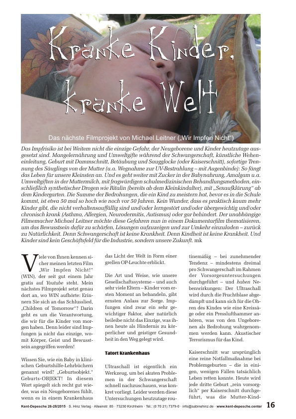 »Das Impfrisiko ist nicht die einzige Gefahr, der Neugeborene und Kinder heutzutage ausgesetzt sind. Mangelernährung und Umweltgifte während der Schwangerschaft, künstliche Weheneinleitung, Geburt mit Dammschnitt, Betäubung und Saugglocke oder Kaiserschnitt, sofortige Trennung des Säuglings von der Mutter (u.a. Wegnahme zur UV-Bestrahlung – mit Augenbinde): So fängt das Leben für unsere Kleinsten an. Und es geht weiter mit Zucker in der Babynahrung, Amalgam u.a. Umweltgiften in der Muttermilch, mit fragwürdigen schulmedizinischen Behandlungsmethoden, einschließlich synthetischer Drogen wie Ritalin bereits ab dem Kleinkindalter, mit „Sexaufklärung“ ab dem Kindergarten. Die Summe der Bedrohungen, die ein Kind zu meistern hat, bevor es in die Schule kommt, ist höher als noch vor 50 Jahren. Kein Wunder, dass es kaum mehr Kinder gibt, die nicht verhaltensauffällig sind und/oder lerngestört und/oder übergewichtig und/oder chronisch krank (Asthma, Allergien, Neurodermitis, Autismus) oder gar behindert. Der unabhängige Filmemacher Michael Leitner möchte diese Gefahren nun in einem Dokumentarfilm thematisieren, um das Bewusstsein dafür zu schärfen, Lösungen aufzuzeigen und zur Umkehr einzuladen – zurück zu Natürlichkeit. Denn Schwangerschaft ist keine Krankheit. Denn Kindheit ist keine Krankheit. Und Kinder sind kein Geschäftsfeld für die Industrie, sondern unsere Zukunft.«