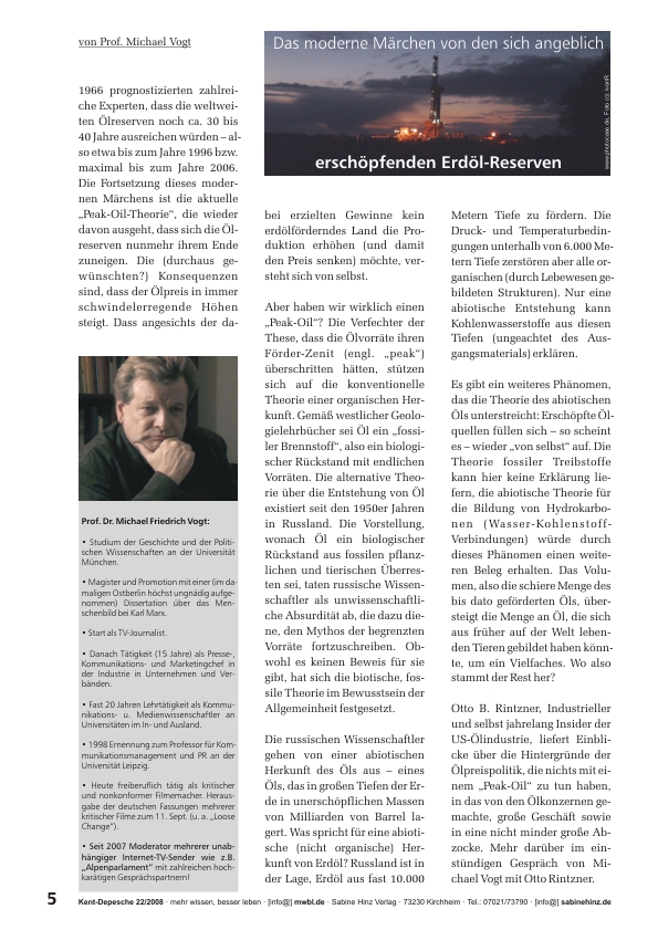 »Die Erdölvorräte gehen keinesfalls, wie das allgemein behauptet wird, zur Neige und es darf mit hoher Wahrscheinlichkeit davon ausgegangen werden, dass Erdöl auch nicht fossilen Ursprungs ist. Gemäß schulwissenschaftlicher Lehre sei Erdöl vor Urzeiten vorwiegend dadurch entstanden, dass abgestorbener Plankton auf den Meeresgrund gesunken sei, von Sedimenten (Sand, Gestein etc.) bedeckt und dann unter großem Druck und Hitze umgewandelt wurde. Deshalb spricht man von „fossilen“ Brennstoffen (fossil: aus frühen erdgeschichtlichen Zeitaltern stammend). Wäre Erdöl fossilen Ursprungs, bedeutete dies, dass die Vorkommen logischerweise endlich wären – so lern(t)en wir das alle. Möglicherweise lern(t)en wir das aber nur deshalb, weil das die erdölfördernde Industrie so wollte. Damit wir nämlich artig immer weiter steigende Öl- und Benzinpreise hinnehmen.«