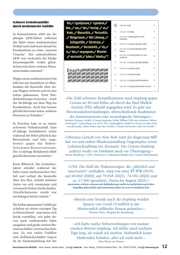 »2020 gab der damalige österreichische Bundeskanzler den berühmten Satz von sich: „Bald wird jeder von uns jemanden kennen, der an Corona gestorben ist.“ Während sich diese Prognose nicht bewahrheitete (britische Studie sagt: nur jeder 20. „Corona-Tote“ starb wirklich an Corona), kennt aber mittlerweile fast jeder jemanden, der „plötzlich und unerwartet“ und zumeist in viel zu jungen Jahren von uns gegangen ist. Wer darüber hinaus gar Todesanzeigen in Tageszeitungen studiert, dem sticht dabei ins Auge, wie oft hier neuerdings Begriffe auftauchen, wie „völlig überraschend“, „ganz plötzlich und unerwartet“, „mitten aus dem Leben gerissen“ o.Ä. Im Folgenden eine erschütternde Aufzählung derartiger Fälle, über die in offiziellen Medien berichtet wurde – ein Zeitdokument, ein Mahnmal!«