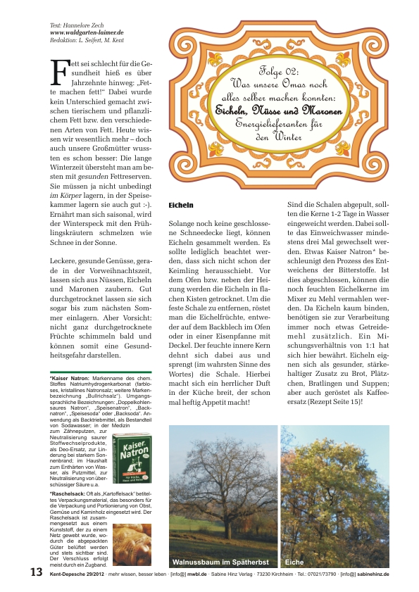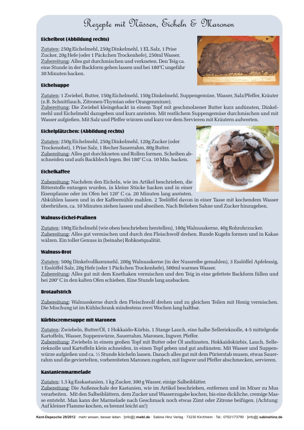 »Leckere, gesunde Genüsse, gerade in der Vorweihnachtszeit, lassen sich aus Nüssen, Eicheln und Maronen zaubern. Gut durchgetrocknet lassen sie sich sogar bis zum nächsten Sommer einlagern. Aber Vorsicht: nicht ganz durchgetrocknete Früchte schimmeln bald und können somit eine Gesundheitsgefahr darstellen.«
