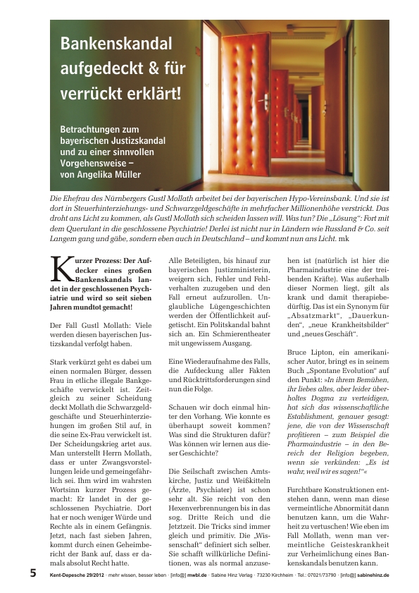 »Die Ehefrau des Nürnbergers Gustl Mollath arbeitet bei der bayerischen Hypo-Vereinsbank. Und sie ist dort in Steuerhinterziehungs- und Schwarzgeldgeschäfte in mehrfacher Millionenhöhe verstrickt. Das droht ans Licht zu kommen, als Gustl Mollath sich scheiden lassen will. Was tun? Die „Lösung“: Fort mit dem Querulant in die geschlossene Psychiatrie! Derlei ist nicht nur in Ländern wie Russland & Co. seit Langem gang und gäbe, sondern eben auch in Deutschland – und kommt nun ans Licht.«