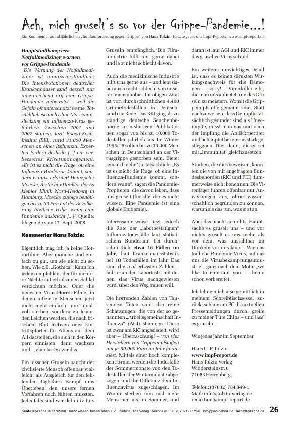 Nie war dieser Kurzartikel aktueller als zu Zeiten von Corona: Über die Art und Weise, wie Grippe-Todesfälle „berechnet“ werden, wie viele laborbestätigte Todesfälle es wirklich gibt, über die „Arbeitsgemeinschaft Influenza“ am RKI, die von Pharmaherstellern finanziert wird und über die Methode der Angsterzeugung – auf dass uns alle vor heimtückischen Viren grusele ...Â