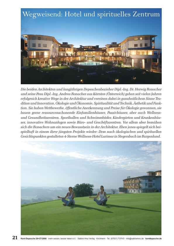 Ein Hotel im österreichischen Burgenland geht neue Wege und verwirklicht konsequent spirituelle Prinzipien beim Bau eines neuen Luxus-Hotels: Architektur nach den Chakren, natürliche Bio-Küche, Yin und Yang, Blume des Lebens, Feng Shui, Zimmer im Stil der vier Elemente Feuer, Erde, Wasser, Luft ...Â