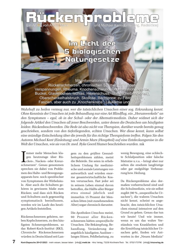 »Wahrhaft zu heilen vermag nur, wer die tatsächlichen Ursachen einer sog. Erkrankung kennt. Ohne Kenntnis der Ursachen ist jede Behandlung nur ein „Herumwerkeln“ an den Symptomen – egal, ob in der Schul- oder der Alternativmedizin. Daher widmet sich der folgende Artikel den Ursachen all jener Beschwerden, unter denen die Deutschen am häufigsten leiden: Rückenbeschwerden. Wer die tieferliegenden Ursachen kennt, kann eine mündige Entscheidung über die jeweils für ihn richtige Therapieform treffen. Folgen Sie den Autoren Michael Kent (Einleitung) und Armin Marx (Hauptteil) auf eine Entdeckungsreise in die Welt der Ursachen von Problemen mit dem halte- und Bewegungsapparat, wie sie von Dr. med. Ryke Geerd Hamer beschrieben wurden.«
