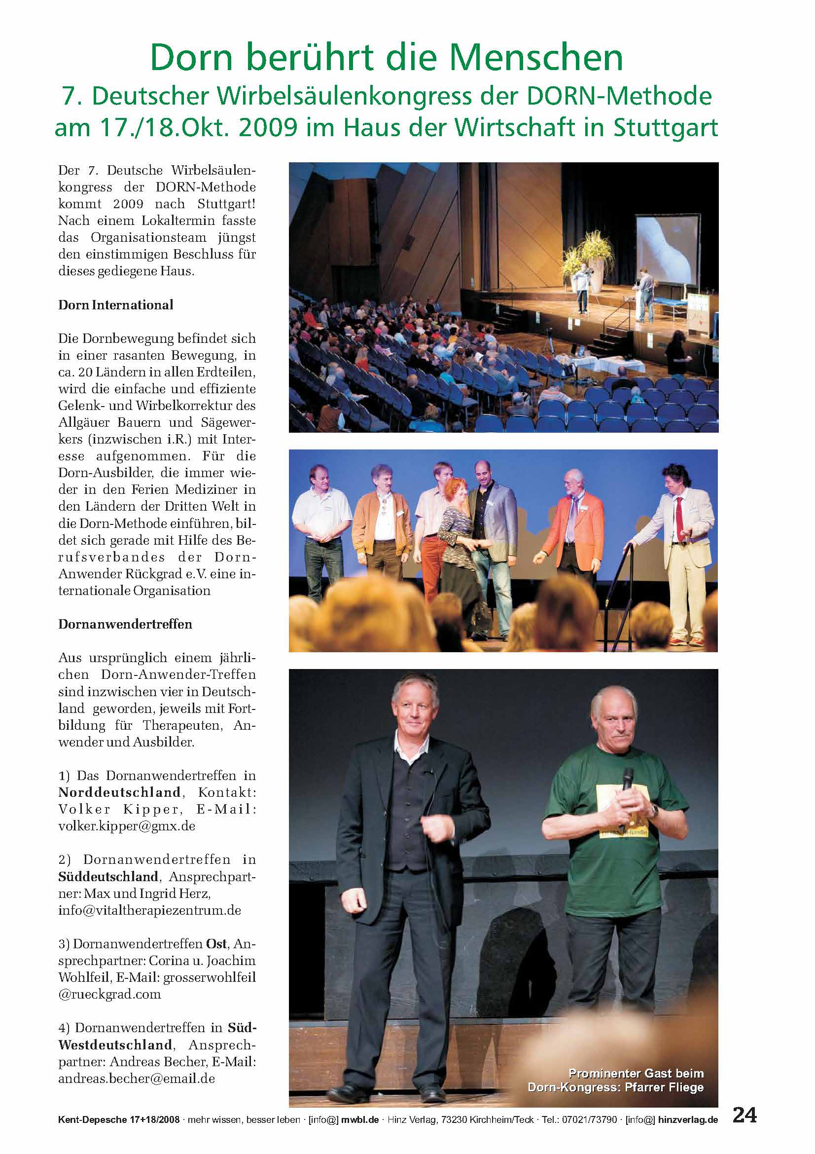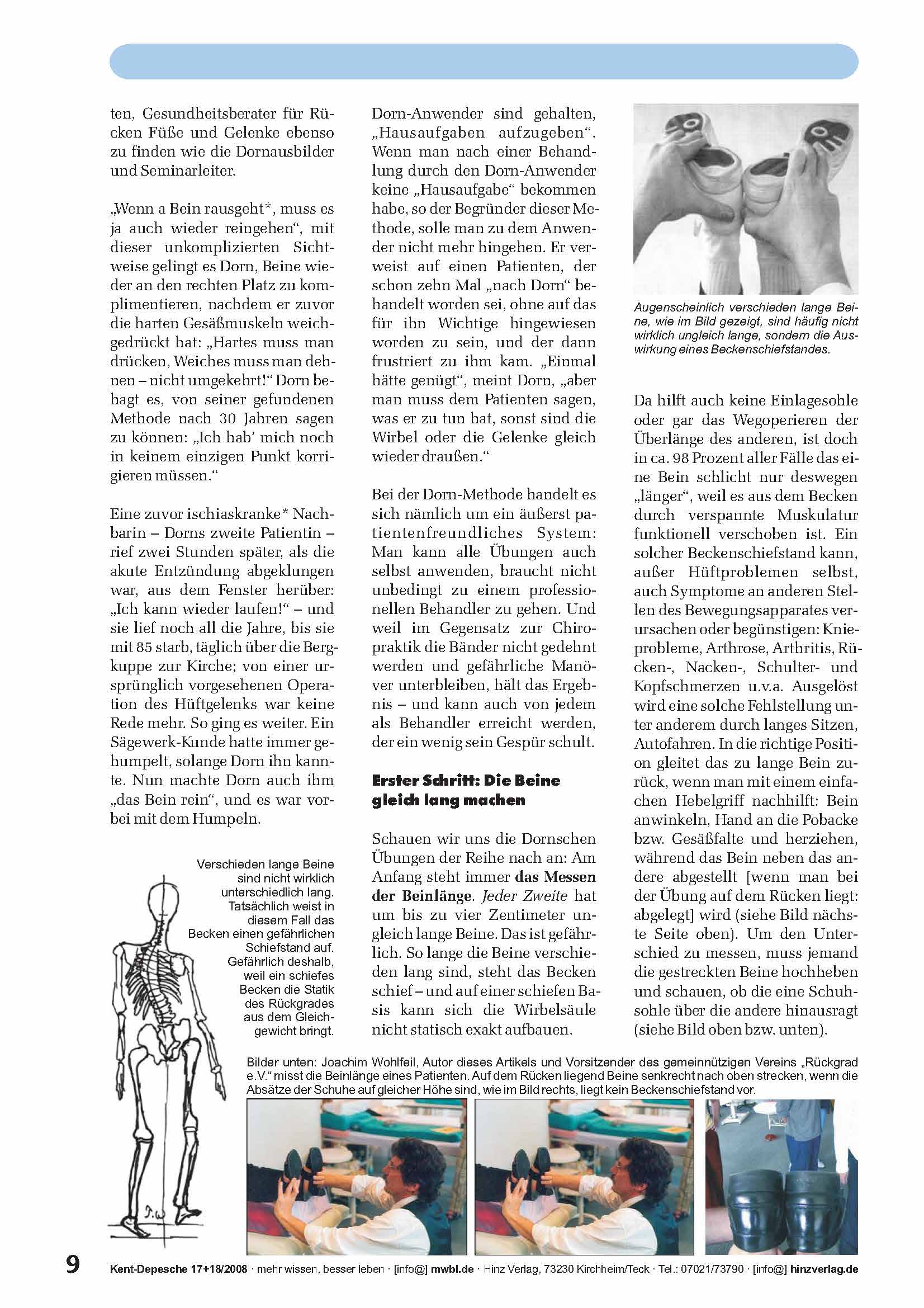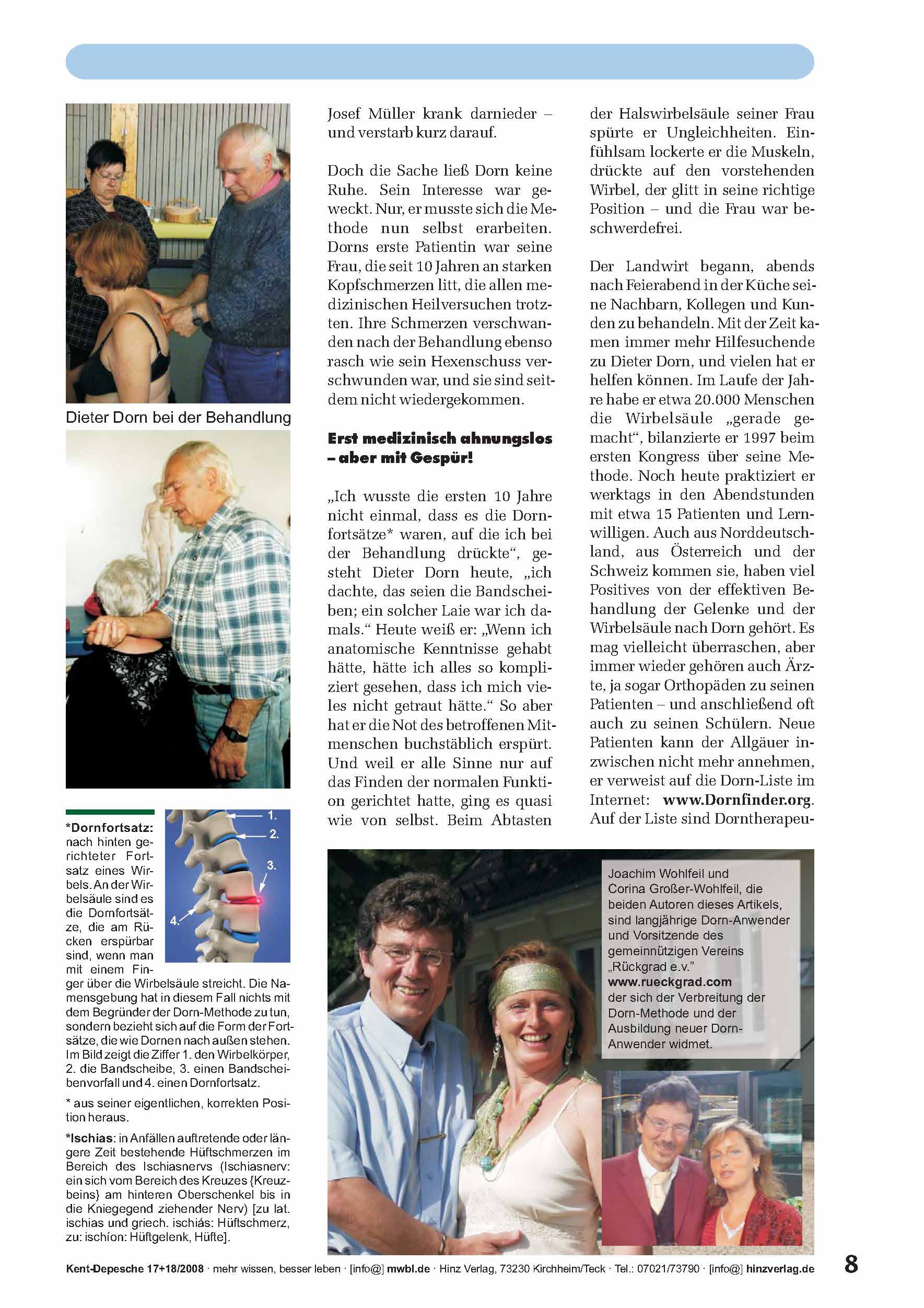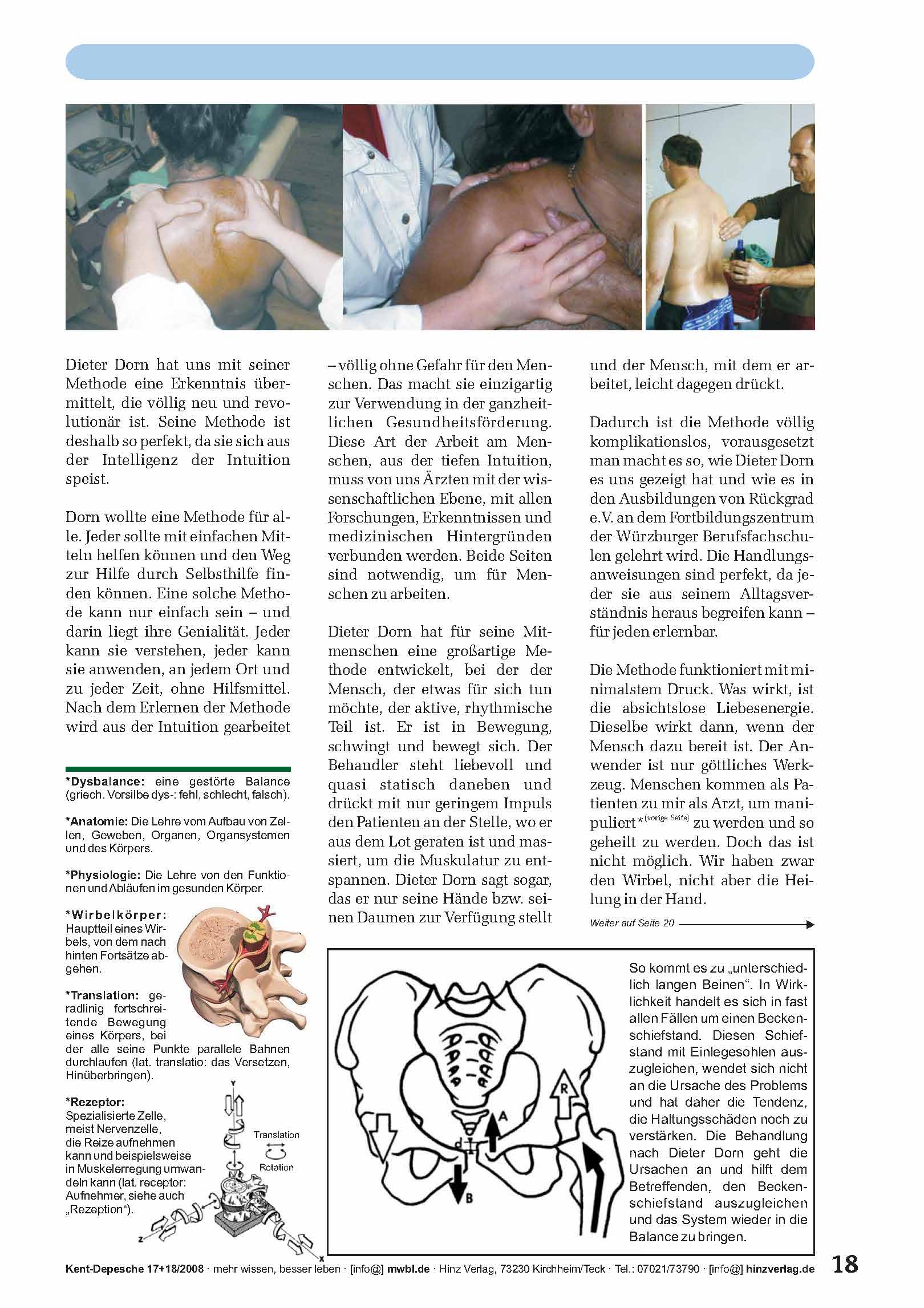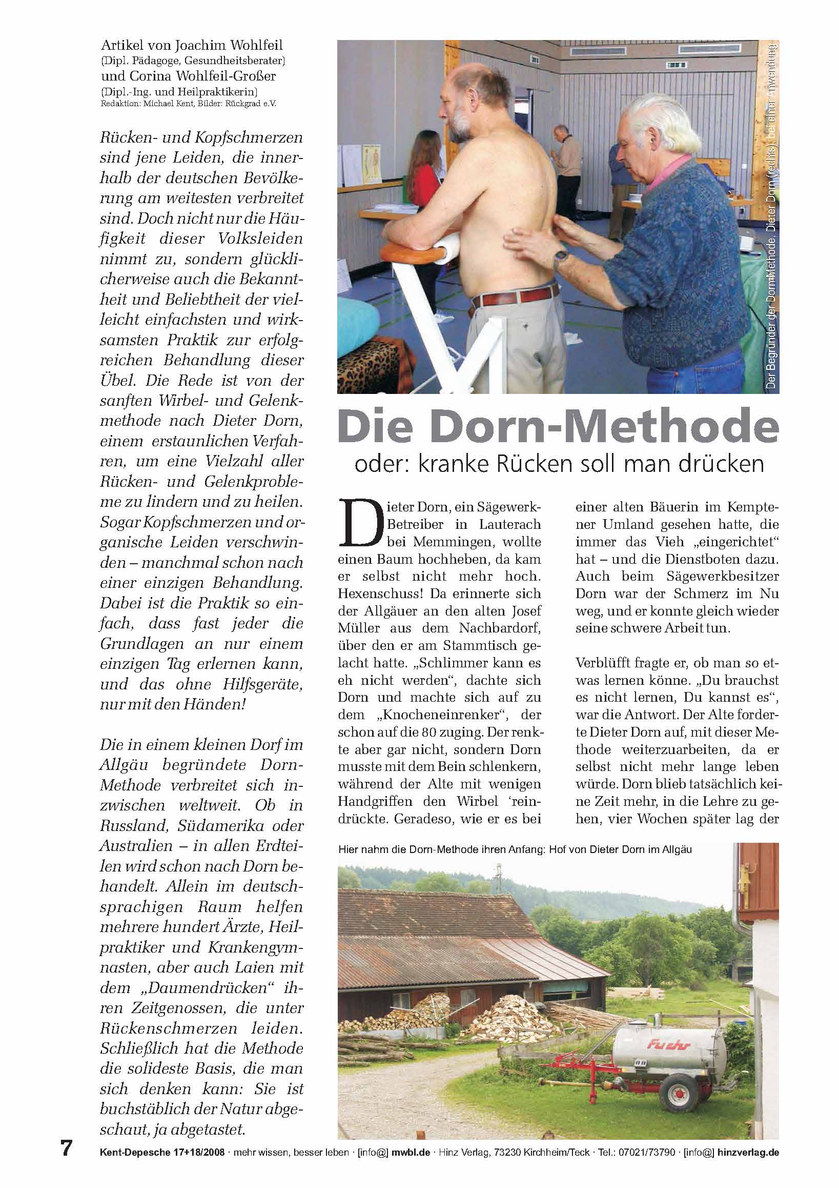 »Rücken- und Kopfschmerzen sind jene Leiden, die innerhalb der deutschen Bevölkerung am weitesten verbreitet sind. Doch nicht nur die Häufigkeit dieser Volksleiden nimmt zu, sondern glücklicherweise auch die Bekanntheit und Beliebtheit der vielleicht einfachsten und wirksamsten Praktik zur erfolgreichen Behandlung dieser Übel. Die Rede ist von der sanften Wirbel- und Gelenkmethode nach Dieter Dorn, einem erstaunlichen Verfahren, um eine Vielzahl aller Rücken- und Gelenkprobleme zu lindern und zu heilen. Sogar Kopfschmerzen und organische Leiden verschwinden – manchmal schon nach einer einzigen Behandlung. Dabei ist die Praktik so einfach, dass fast jeder die Grundlagen an nur einem einzigen Tag erlernen kann, und das ohne Hilfsgeräte, nur mit den Händen! Die in einem kleinen Dorf im Allgäu begründete Dorn-Methode verbreitet sich inzwischen weltweit. Ob in Russland, Südamerika oder Australien – in allen Erdteilen wird schon nach Dorn behandelt. Allein im deutschsprachigen Raum helfen mehrere hundert Ärzte, Heilpraktiker und Krankengymnasten, aber auch Laien mit dem „Daumendrücken“ ihren Zeitgenossen, die unter Rückenschmerzen leiden. Schließlich hat die Methode die solideste Basis, die man sich denken kann: Sie ist buchstäblich der Natur abgeschaut, ja abgetastet.«