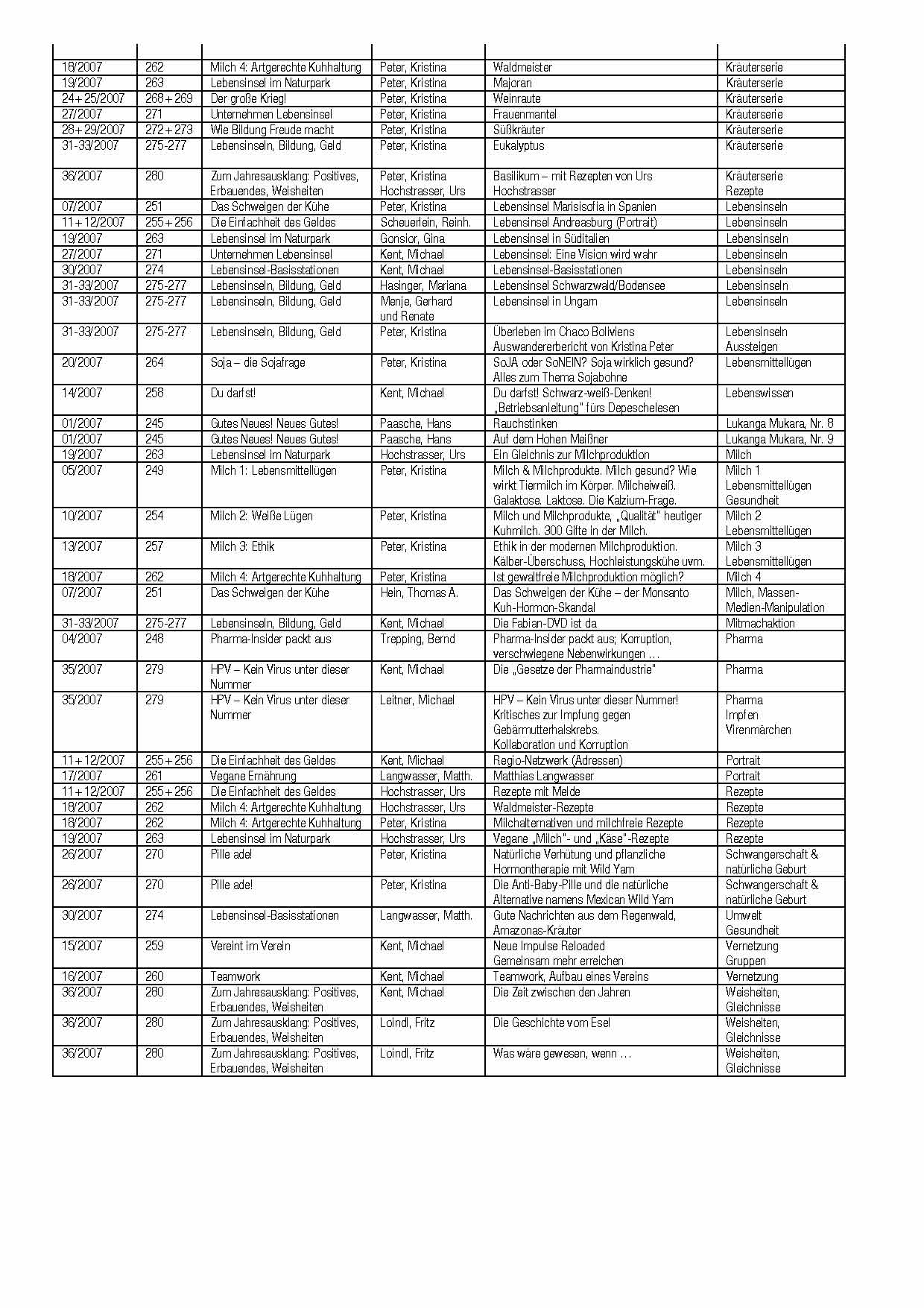 • Kräuterserie • Grünnahrung · Ideale Menschennahrung • Blut: unser wichtigstes Organ • Die Mikrobe ist nichts, das Milieu ist alles. • Nierensteine-, Gallensteine-Reinigung nach Dr. Hulda Clark. • Pharma-Insider packt aus. • Milchserie „Weiße Lügen“ mit milchfreien Rezepten. • Lebensmittellügen • Lebensinseln • Die "Mammon-Sekte" • Die Einfachheit des Geldes • Hochfinanz, warum Kriege geführt werden! • Ein neues Geldmodell • Fallbericht Zwangspsychiatrisierung • "Du darfst!" Schwarz-weiß-Denken. „Betriebsanleitung“ fürs Depeschelesen. • Vegane Ernährung – die Zukunft der Erde liegt auf unseren Tellern! • Vegane Kochkunst, kreative vegane Küche • SoJA oder SoNEIN? Soja wirklich gesund? • Die größte Sekte von allen: Psycho-Sekte „Weltpsychiatrie“. • Materialismus und die Propaganda der Endlichkeit. • Der große Krieg; Materialismus gegen die Spiritualität. • Wie Bildung Freude macht: Bildungsreform und Bildungsfreiheit. Freies Lernen in Deutschland (Homescooling), Theorie & Praxis · Phänomene beim Lernen. • Auswandererbericht Bolivien. • Gentechnik: Bio-Tech- und „LifeScience“, Saatgutproblematik. Das Samen-Archiv. • HPV: Kein Virus unter dieser Nummer.