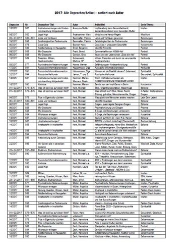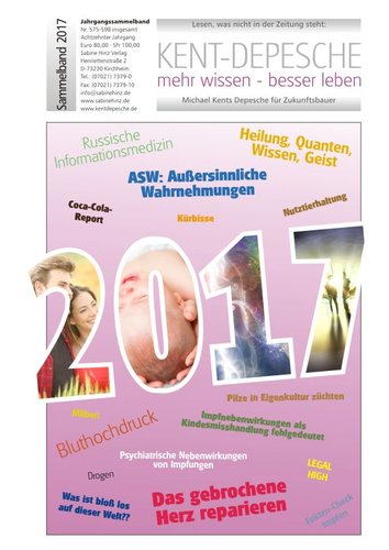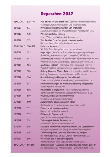 Wichtigste Stichwörter im Jahrgang 2017: Außersinnliche Wahrnehmungen (ASW), authentische Erzählungen aus dem Leserkreis, Bluthochdruck (aus Sicht der 5 biol. Naturgesetze), der Coca-Cola-Report – die unsauberen Geschäfte des Weltkonzerns; moderne Drogen und „harmlose“ Partypillen, „Heilung, Quanten, Wissen, Geist“; Parasiten, Milben und Hautkrankheiten – Symptome und Therapiemöglichkeiten. „Das gebrochene Herz reparieren“ – Liebe, Vertrauen und Beziehungen verbessern; Nutztierhaltung im Hausgarten, Selbstversorgerserie: milchsauer einlegen u.v.m., Pilze und Kürbisse in Eigenkultur/Eigenanbau; Impfstoffe: Herstellungsverfahren, nicht deklarierte Inhaltsstoffe, Zusatzstoffe, psychiatrische Nebenwirkungen von Impfungen; Krebsheilung durch Cannabis, Methadon u.a. Drogen? Mit Informationen zu Vit. B17, Chemo und Hormontherapie. Russische Heilkunde, Russische Informationsmedizin …