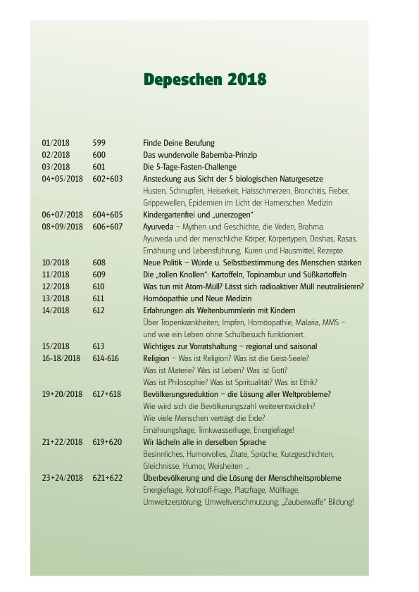 • Finde Deine Berufung. • Das wundervolle Babemba-Prinzip. • Die 5-Tage-Fasten-Challenge. • Ansteckung aus Sicht der 5 biologischen Naturgesetze: Husten, Schnupfen, Heiserkeit, Halsschmerzen, Bronchitis, Fieber, Grippewellen, Epidemien im Licht der Hamerschen Medizin. • Kindergartenfrei und „unerzogen“.