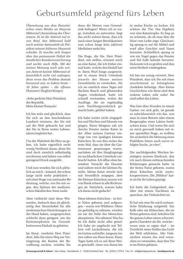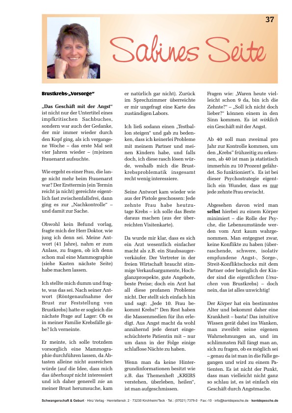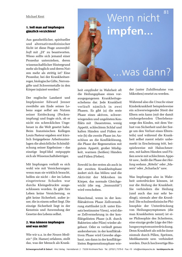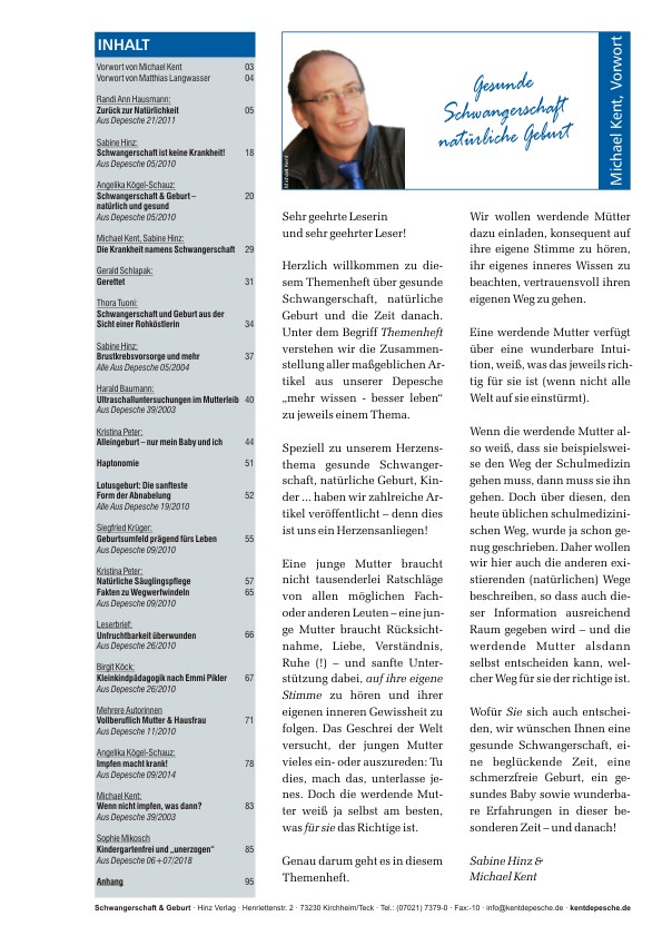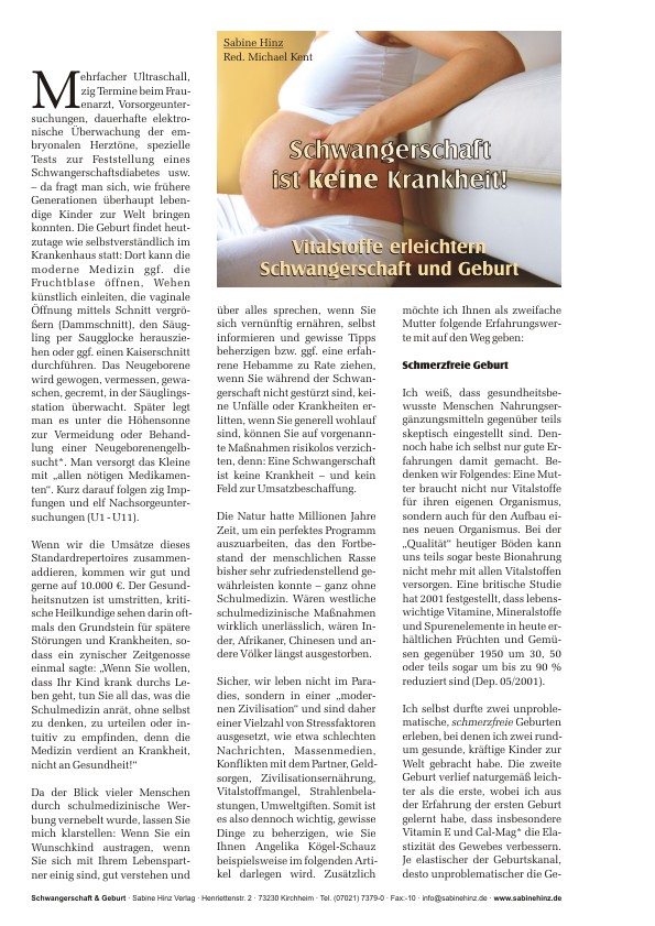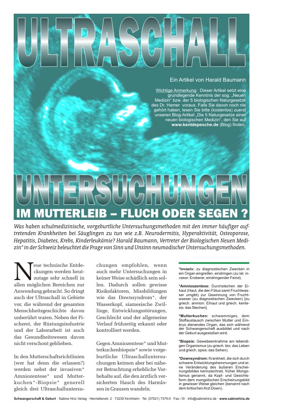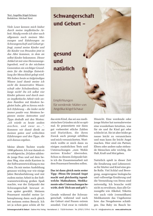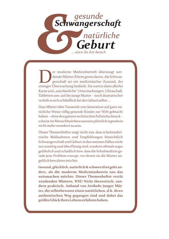 Dieses Themenheft zeigt, dass schulmedizinische Maßnahmen und Empfehlungen hinsichtlich Schwangerschaft und Geburt in den meisten Fällen nicht nur unnötig und überflüssig sind, sondern oftmals sogar gefährlich und schädlich bzw. dass die Schulmedizin gerade jene Problem erzeugt, vor denen sie die Mutter angeblich bewahren möchte.