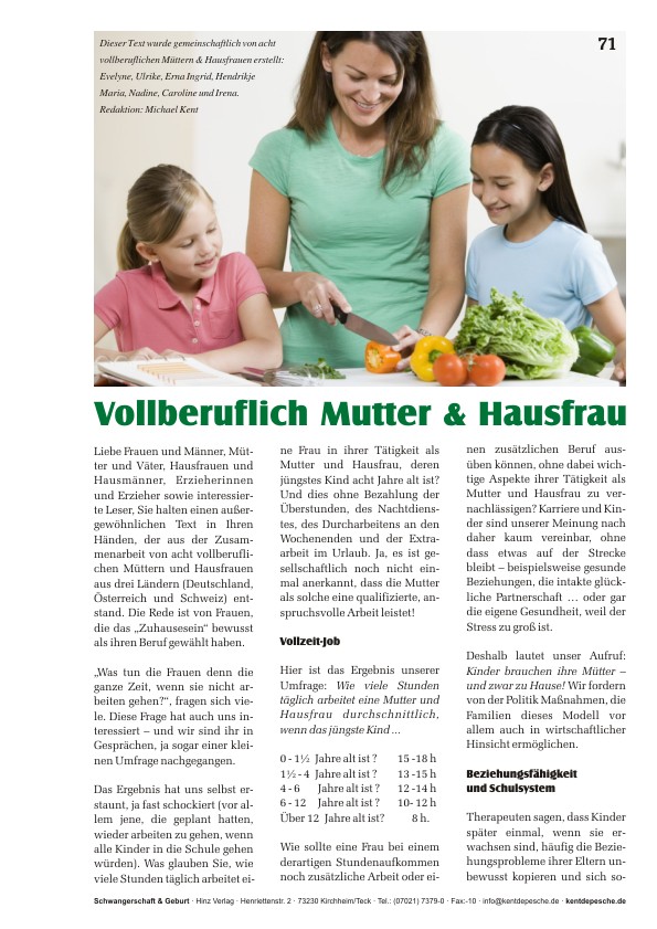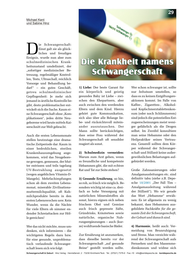Der moderne Medizinbetrieb überzeugt werdende Mütter/Eltern gerne davon, die Schwangerschaft sei ein medizinischer Zustand, der strenger Überwachung bedürfe. Da warten dann allerlei Kurse und „unerlässliche“ Untersuchungen, Ultraschall, Tabletten usw. auf die junge Mutter – noch dramatischer verhält es sich schließlich bei der Geburt selbst ...