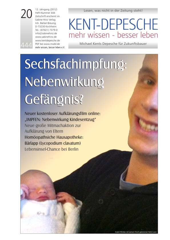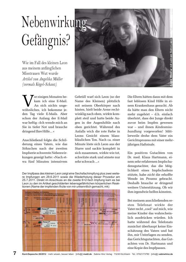 »Dem Studenten André Winkler (Name geändert) wurde vom Familiengericht der Kontakt zu Frau und Kind verboten. Grund: Sein kleiner Sohn Leon zeigte nach einer Sechsfachimpfung allerschwerste Nebenwirkungen. Sein Gesicht lief rot an, er schrie wie am Spieß, verfiel kurzzeitig in eine seltsame Starre, wurde bleich, atmete dann so schwach, dass der Vater ihm eine Mund-zu-Mund-Beatmung gab und mit ihm sofort den Hausarzt aufsuchte. Von dort wurde der Junge ins Krankenhaus gebracht, wo bei ihm Sauerstoffmangel festgestellt und Sauerstoff verabreicht wurde. Alle Symptome des Kindes deuten auf Nebenwirkungen der vorausgegangenen Mehrfachimpfung hin, wurden von den Ärzten aber als Symptome einer Kindesmisshandlung fehlgedeutet! Wesentliche Untersuchungen, die den Vater hätten entlasten und und Impfschaden den klar beweisen können, unterblieben.«