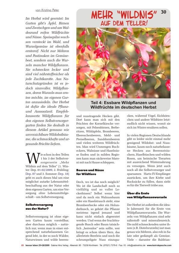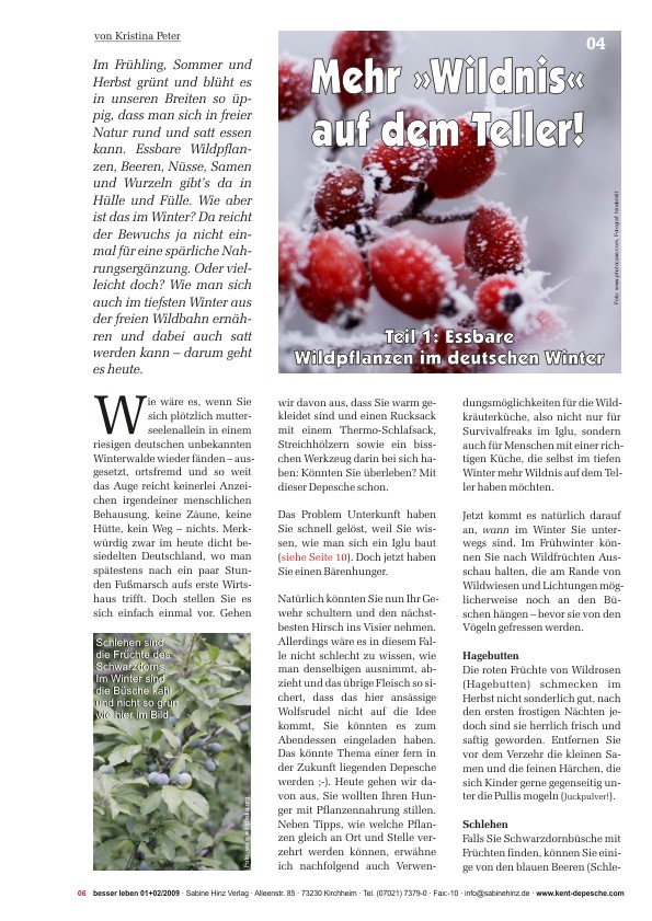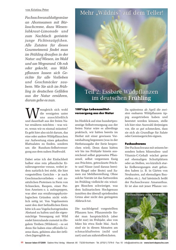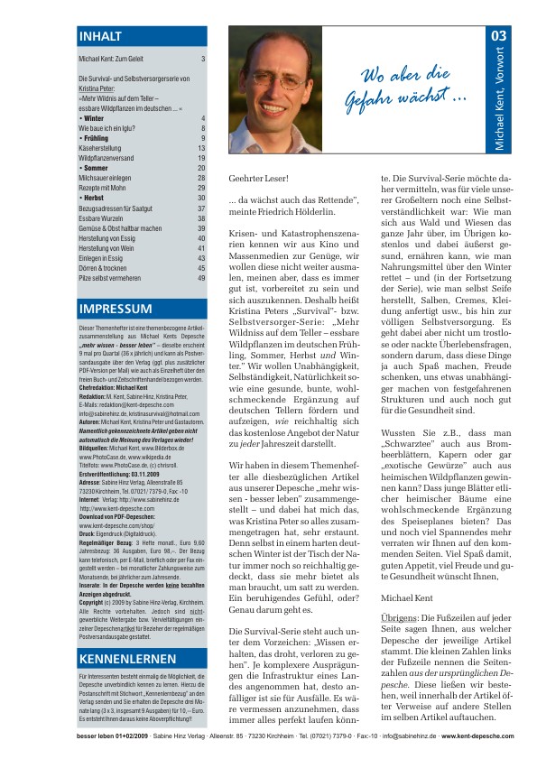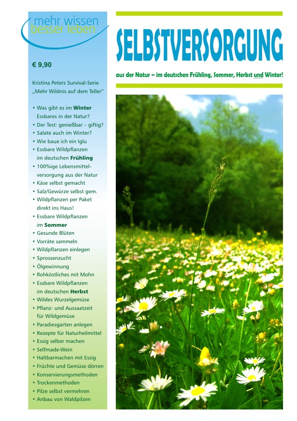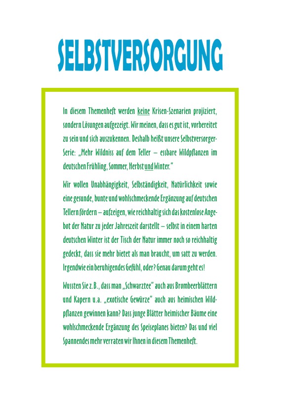 In diesem Themenheft werden keine Krisen-Szenarien projiziert, sondern Lösungen aufgezeigt. Wir meinen, dass es gut ist, vorbereitet zu sein und sich auszukennen. Deshalb heißt unsere Selbstversorger-Serie: „Mehr Wildnis auf dem Teller – essbare Wildpflanzen im deutschen Frühling, Sommer, Herbst und Winter.“