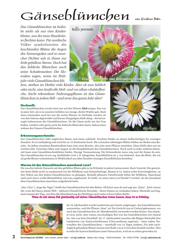 Das Gänseblümchen ist beileibe mehr als nur eine Kinderblume, aus der man Haarkränze flechten kann. Für nordische Völker symbolisierten die leuchtenden Blüten die Augen des Sonnengottes und so mancher Dichter sah in ihnen zur Erde gefallene Sterne. Doch hat das liebliche Blümchen auch seine Schattenseiten: Die Slowaken sagen, wenn im Frühjahr viele Gänseblümchen blühen, sterben im Herbst viele Kinder. Aber ob nun lieblich oder nicht, eine kraftvolle Heil- und vor allem vitalstoffreiche, leicht erkennbare Nahrungspflanze ist das Gänseblümchen in jedem Fall – und zwar das ganze Jahr über!