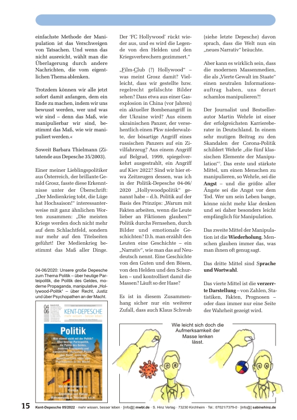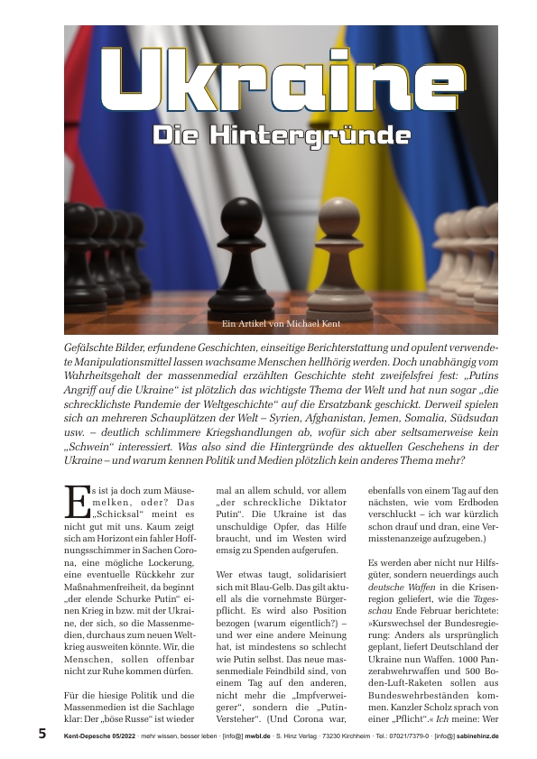 »Gefälschte Bilder, erfundene Geschichten, einseitige Berichterstattung und opulent verwendete Manipulationsmittel lassen wachsame Menschen hellhörig werden. Unabhängig vom Wahrheitsgehalt der massenmedial erzählten Geschichte steht fest: „Putins Angriff auf die Ukraine“ ist plötzlich das wichtigste Thema der Welt und hat nun sogar „die schrecklichste Pandemie der Weltgeschichte“ auf die Ersatzbank geschickt. Was also sind die Hintergründe des aktuellen Geschehens in der Ukraine – und warum kennen Politik und Medien plötzlich kein anderes Thema mehr?«