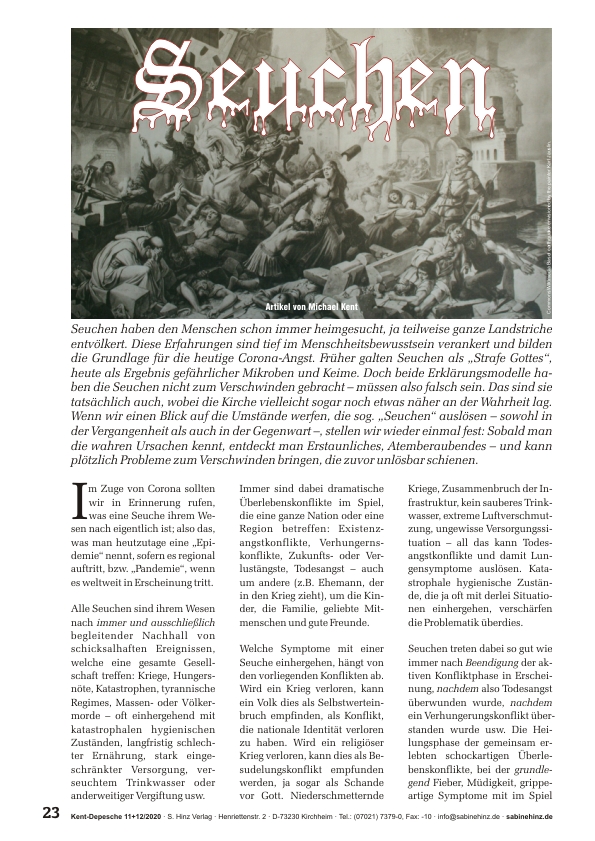 Seuchen haben den Menschen schon immer heimgesucht, ja teilweise ganze Landstriche entvölkert. Diese Erfahrungen sind tief im Menschheitsbewusstsein verankert und bilden die Grundlage für die heutige Corona-Angst. Früher galten Seuchen als „Strafe Gottes“, heute als Ergebnis gefährlicher Mikroben und Keime. Doch beide Erklärungsmodelle haben die Seuchen nicht zum Verschwinden gebracht – müssen also falsch sein. Das sind sie tatsächlich auch, wobei die Kirche vielleicht sogar noch etwas näher an der Wahrheit lag. Wenn wir einen Blick auf die Umstände werfen, die sog. „Seuchen“ auslösen – sowohl in der Vergangenheit als auch in der Gegenwart –, stellen wir wieder einmal fest: Sobald man die wahren Ursachen kennt, entdeckt man Erstaunliches, Atemberaubendes – und kann plötzlich Probleme zum Verschwinden bringen, die zuvor unlösbar schienen.