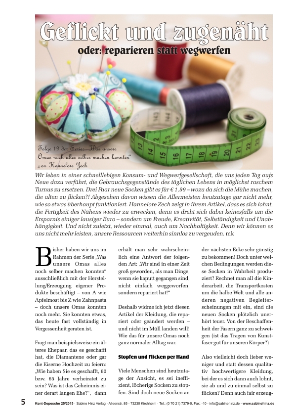 »Wir leben in einer Konsum- und Wegwerfgesellschaft, die uns dazu verführt, die Gebrauchsgegenstände des täglichen Lebens in möglichst raschem Turnus zu ersetzen. Drei Paar neue Socken gibt es für € 1,99 – wozu da sich die Mühe machen, die alten zu flicken?! Abgesehen davon wissen die meisten heutzutage gar nicht mehr, wie das funktioniert. Hannelore Zech zeigt in ihrem Artikel, dass es sich lohnt, die Fertigkeit des Nähens wieder zu erwecken, denn es dreht sich dabei keinesfalls um die Ersparnis einiger Euro – sondern um Freude, Kreativität, Selbständigkeit und Unabhängigkeit. Und nicht zuletzt, wieder einmal, auch um Nachhaltigkeit. Denn wir können es uns nicht mehr leisten, unsere Ressourcen weiterhin sinnlos zu vergeuden.«