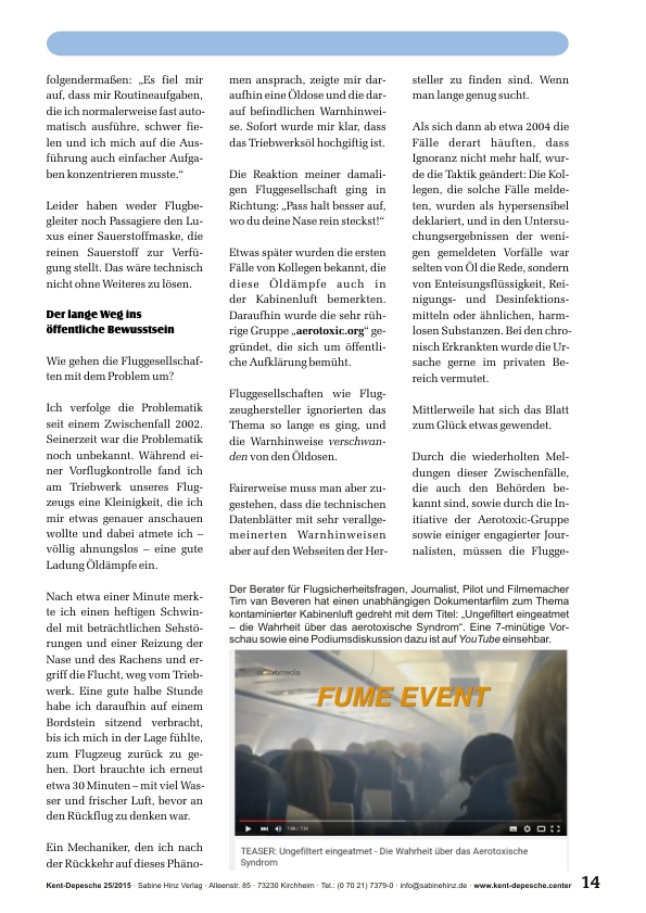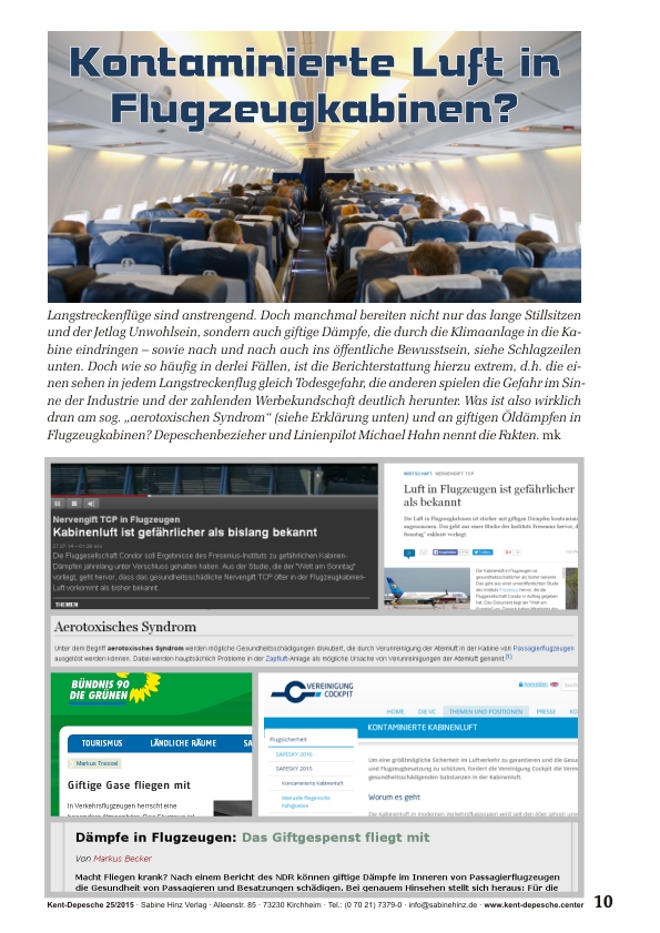 »Langstreckenflüge sind anstrengend. Doch manchmal bereiten nicht nur das lange Stillsitzen und der Jetlag Unwohlsein, sondern auch giftige Dämpfe, die durch die Klimaanlage in die Kabine eindringen – sowie nach und nach auch ins öffentliche Bewusstsein. Doch wie so häufig in derlei Fällen, ist die Berichterstattung hierzu extrem, d.h. die einen sehen in jedem Langstreckenflug gleich Todesgefahr, die anderen spielen die Gefahr im Sinne der Industrie und der zahlenden Werbekundschaft deutlich herunter. Was ist also wirklich dran am sog. „aerotoxischen Syndrom“ und an giftigen Öldämpfen in Flugzeugkabinen? Linienpilot Michael Hahn nennt die Fakten.«