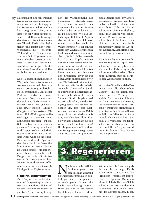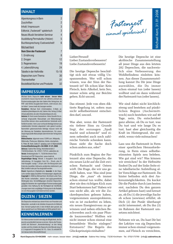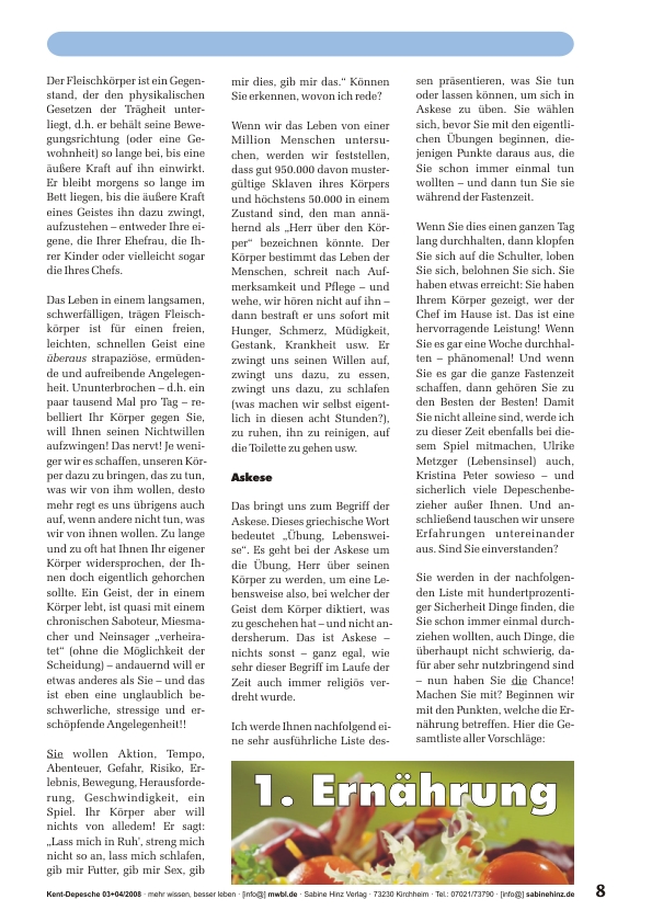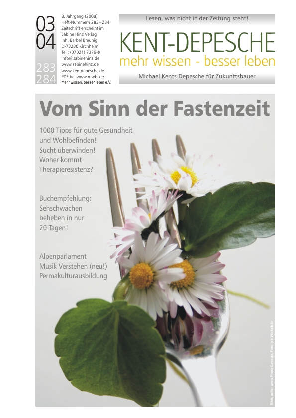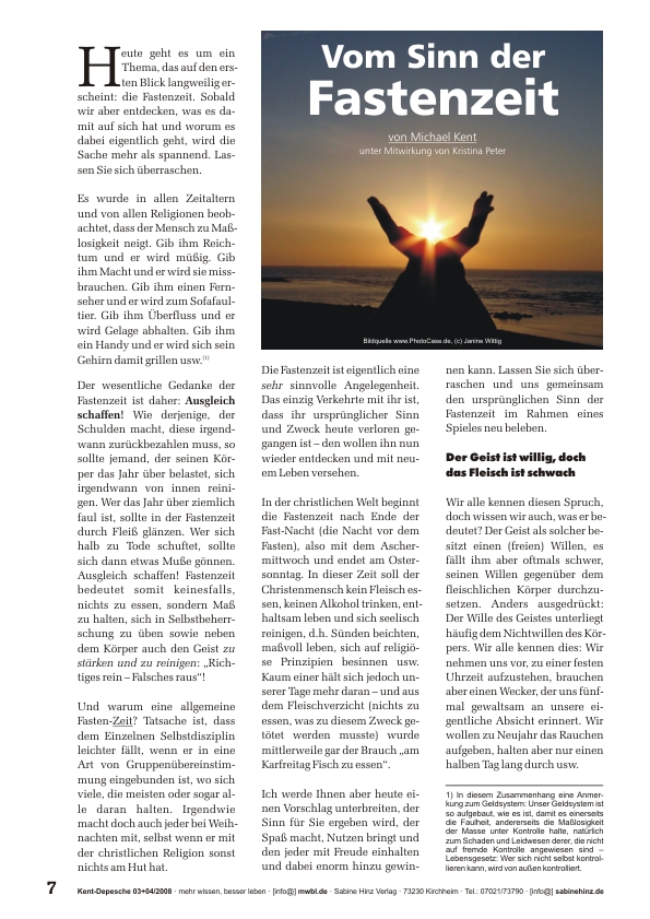 »Heute geht es um ein Thema, das auf den ersten Blick langweilig erscheint: die Fastenzeit. Sobald wir aber entdecken, was es damit auf sich hat und worum es dabei eigentlich geht, wird die Sache mehr als spannend. Lassen Sie sich überraschen. Es wurde in allen Zeitaltern und von allen Religionen beobachtet, dass der Mensch zu Maßlosigkeit neigt. Gib ihm Reichtum und er wird müßig. Gib ihm Macht und er wird sie missbrauchen. Gib ihm einen Fernseher und er wird zum Sofafaultier. Gib ihm Überfluss und er wird Gelage abhalten. Gib ihm ein Handy und er wird sich sein Gehirn damit grillen usw. Der wesentliche Gedanke der Fastenzeit ist daher: Ausgleich schaffen! Wie derjenige, der Schulden macht, diese irgendwann zurückbezahlen muss, so sollte jemand, der seinen Körper das Jahr über belastet, sich irgendwann von innen reinigen. Wer das Jahr über ziemlich faul ist, sollte in der Fastenzeit durch Fleiß glänzen. Wer sich halb zu Tode schuftet, sollte sich dann etwas Muße gönnen. Ausgleich schaffen! Fastenzeit bedeutet somit keinesfalls, nichts zu essen, sondern Maß zu halten, sich in Selbstbeherrschung zu üben sowie neben dem Körper auch den Geist zu stärken und zu reinigen: „Richtiges rein – Falsches raus“!«