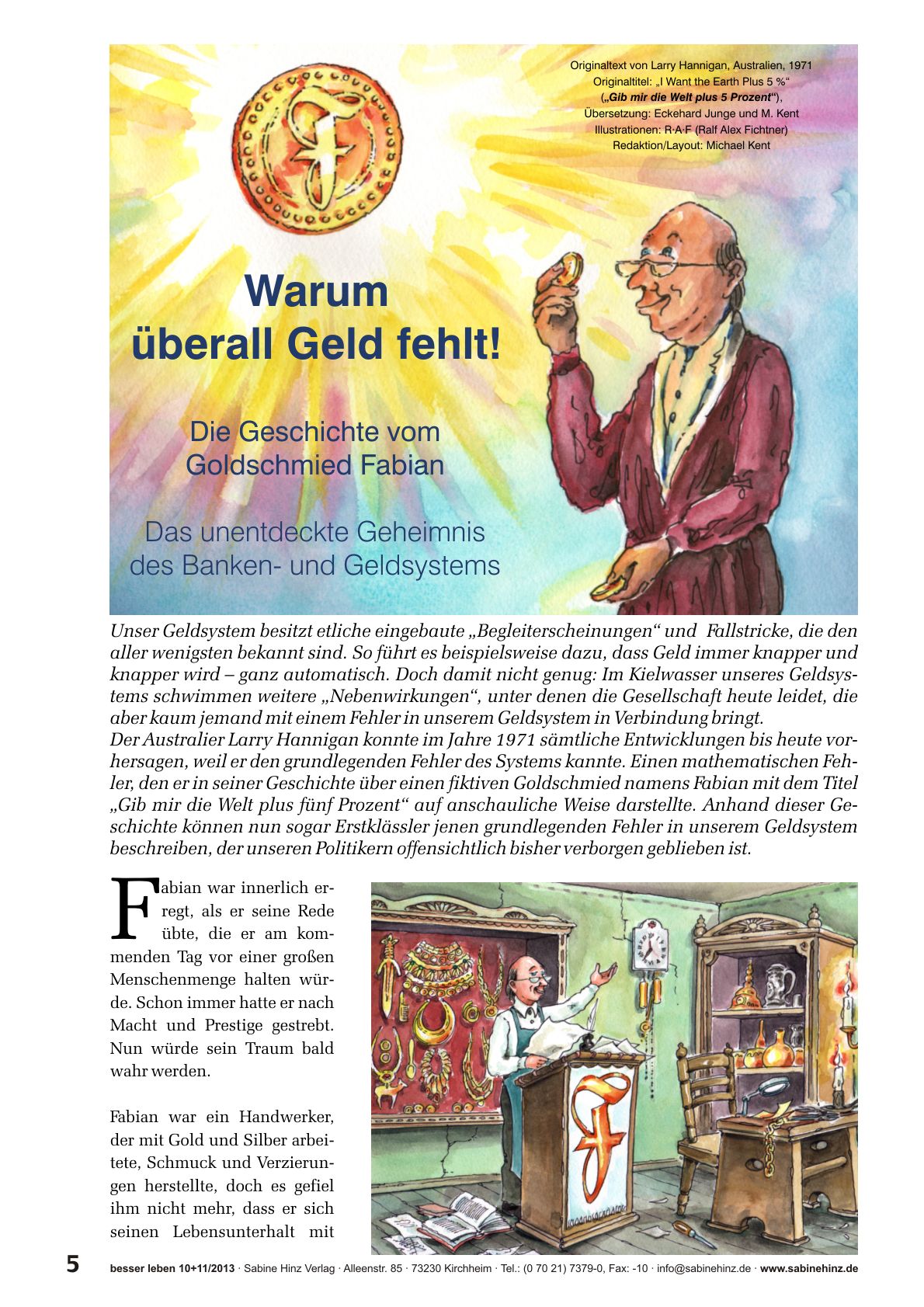 Unser Geldsystem besitzt etliche eingebaute „Begleiterscheinungen“ und Fallstricke, die den wenigsten bekannt sind. So führt es dazu, dass Geld immer knapper und knapper wird – ganz automatisch. Doch damit nicht genug: Im Kielwasser des Systems schwimmen weitere „Nebenwirkungen“, unter denen die Gesellschaft heute leidet, die aber kaum jemand mit einem Fehler in unserem Geldsystem in Verbindung bringt. Der Australier Larry Hannigan konnte im Jahre 1971 sämtliche Entwicklungen bis heute vorhersagen, weil er den grundlegenden Fehler des Systems kannte. Einen mathematischen Fehler, den er in seiner Geschichte über einen fiktiven Goldschmied namens Fabian mit dem Titel „Gib mir die Welt plus fünf Prozent“ auf anschauliche Weise darstellte. Anhand dieser Geschichte können nun sogar Erstklässler jenen grundlegenden Fehler in unserem Geldsystem beschreiben, der Politikern offensichtlich bisher verborgen geblieben ist.