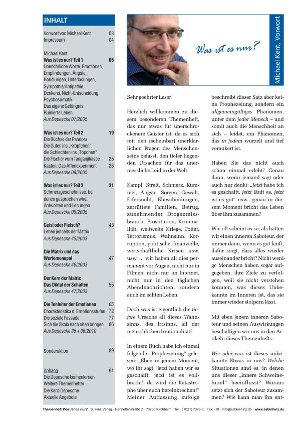 „Was ist es nur?“ Hier geht es um unsere ungewollten Worte, Gedanken, Emotionen, Handlungen, Unterlassungen, Zwänge, Verdrängungen, Blockaden, Alpträume, um unerklärliche psychosomatische Schmerzen, Leiden und Beschwerden – und um die Fragen, warum wir nur wenige Prozent unseres Potentials nutzen, was uns von unseren Zielen ablenkt, unsere Träume zunichtemacht, unsere Erinnerungsfähigkeit blockiert …