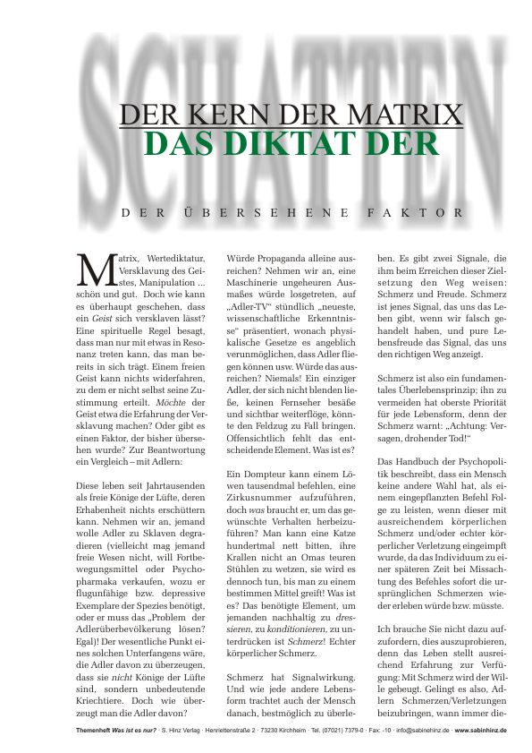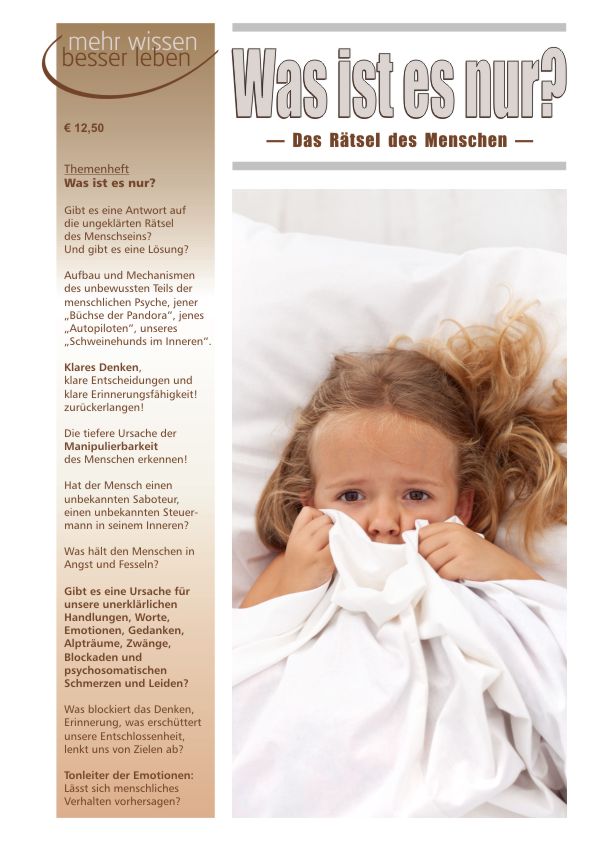 Was hält den Menschen in Ketten? Was ist die Ursache seines oft unergründlichen Verhaltens? Was ist der „Schweinehund im Inneren”, der augenscheinlich die Macht besitzt, Beziehungen zu zerbrechen, Liebe zu zerstören, Kriege auszulösen und unendliches Leid über die Menschheit zu bringen? Kein Roman der Weltliteratur, kein Groschenheft, keine TV-Seifenoper, kein Hollywoodstreifen, der sich nicht mit dieser Frage beschäftigte. Doch nie zuvor war die Antwort gefunden worden – ist der Mensch der Beantwortung absichtlich aus dem Weg gegangen? Richten wir heute ein Licht auf das Unergründliche, werfen wir einen Blick auf die unerklärlichen Rätsel des Menschen ...