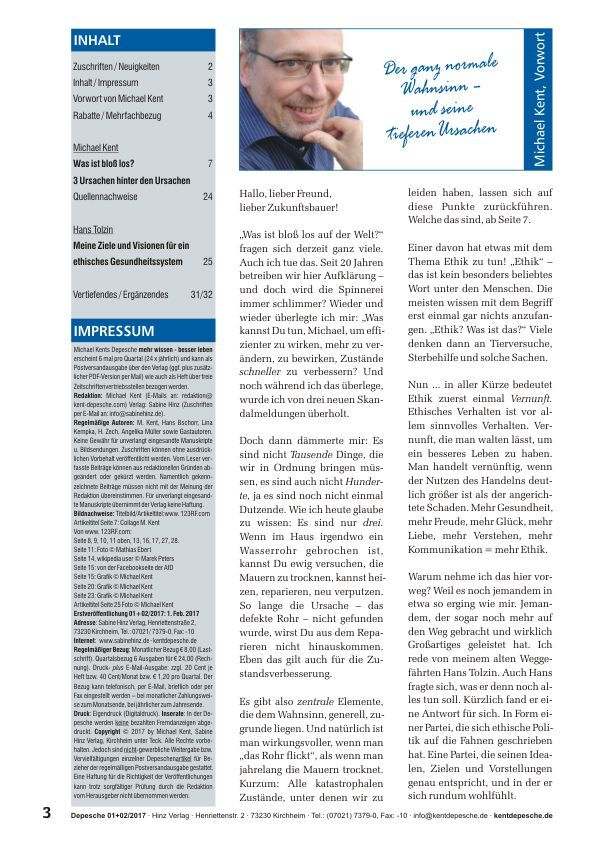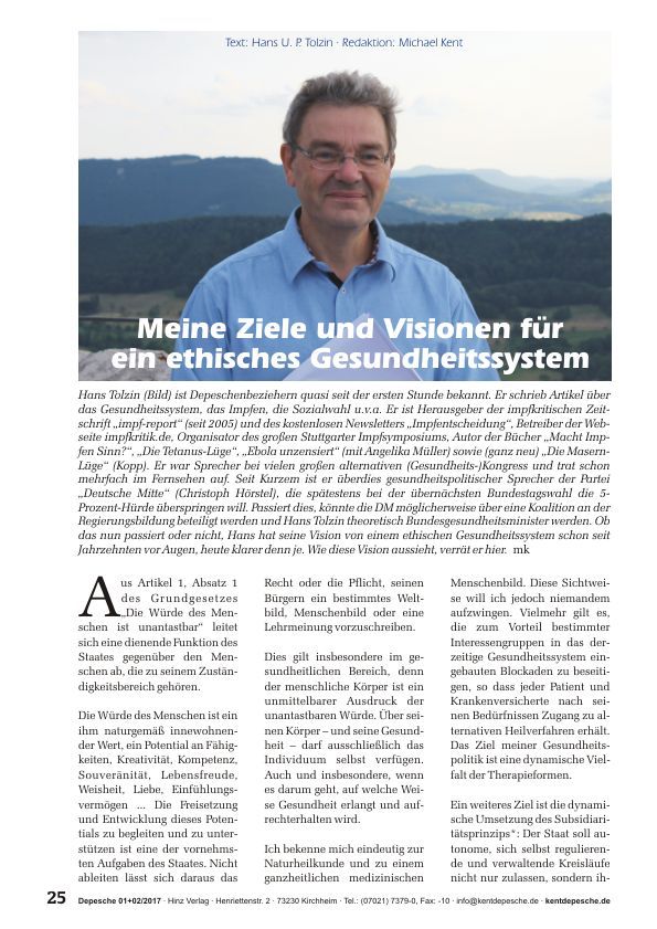 Hans Tolzin ist Depeschenbeziehern seit der ersten Stunde bekannt. Er schrieb Artikel übers Gesundheitssystem, das Impfen, die Sozialwahl u.v.a. Er ist Herausgeber der impfkritischen Zeitschrift „impf-report“, Betreiber der Webseite impfkritik.de, Organisator des großen Stuttgarter Impfsymposiums, Autor der Bücher „Macht Impfen Sinn?“, „Die Tetanus-Lüge“, „Ebola unzensiert“ sowie „Die Masern-Lüge“. Er war Sprecher bei vielen großen alternativen (Gesundheits-)Kongress und trat schon mehrfach im Fernsehen auf. Seit Kurzem ist er überdies gesundheitspolitischer Sprecher der Partei „Deutsche Mitte“. Hans hat seine Vision eines ethischen Gesundheitssystems schon seit Jahrzehnten vor Augen, heute klarer denn je. Wie diese Vision aussieht, verrät er hier.