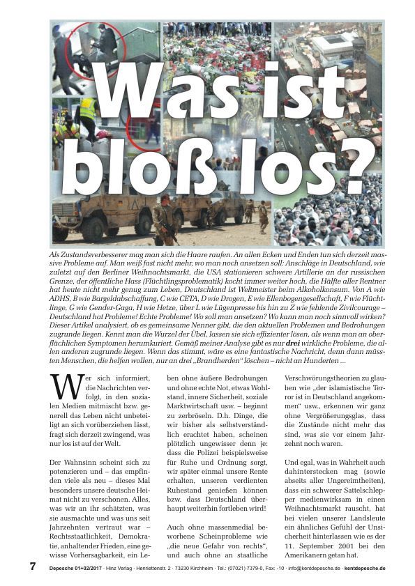 An allen Ecken und Enden tun sich derzeit massive Probleme auf: Anschläge in Deutschland, der öffentliche Hass (Flüchtlingsproblematik) kocht hoch, die Hälfte aller Rentner hat nicht genug zum Leben, Deutschland ist Weltmeister beim Alkoholkonsum. Von A wie ADHS, B wie Bargeldabschaffung, C wie CETA, D wie Drogen, E wie Ellenbogengesellschaft, F wie Flüchtlinge, G wie Gender-Gaga, H wie Hetze, über L wie Lügenpresse bis hin zu Z wie fehlende Zivilcourage – Deutschland hat echte Probleme! Wo soll man ansetzen? Wo kann man sinnvoll wirken? Diese Depesche analysiert, ob es gemeinsame Nenner gibt, die den aktuellen Problemen und Bedrohungen zugrunde liegen. Kennt man die Wurzel der Übel, lassen sie sich effizienter lösen, als wenn man an oberflächlichen Symptomen herumkuriert. Gemäß meiner Analyse gibt es drei – und nur drei – Hauptprobleme, die allen anderen zugrunde liegen. Wenn das stimmt, ist das eine fantastische Nachricht, denn dann müssten Menschen, die helfen wollen, nur an drei „Brandherden“ löschen – nicht an Hunderten ...