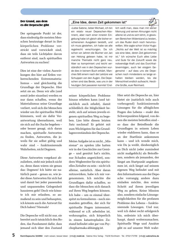 »Meine Aufgabe ist es nicht, „Missionar“ zu spielen (die hatten wir in der Geschichte zur Genüge – und genützt hat’s nichts, nur Schaden angerichtet), sondern Wegbereiter für ein spirituelles Zeitalter zu sein – nicht ich alleine, natürlich. Aber daran mitzuwirken, habe ich mir vorgenommen. Ich möchte die Grundlagen dafür schaffen, so dass die Menschen sich danach auf ihren Weg begeben können. Ich habe – um es einmal überspitzt zu formulieren – noch niemanden getroffen, der sich für spirituelle Fragen interessiert, während er z.B. arbeitslos ist, wohnungslos, sich körperlich in einem katastrophalen Zustand befindet oder gar von Psychopharmaka abhängig ist.«
