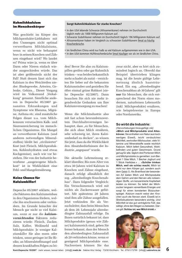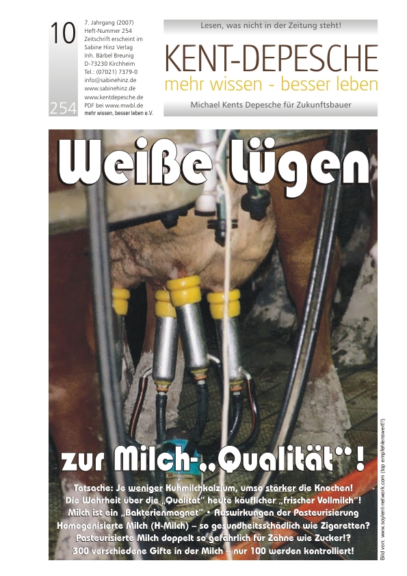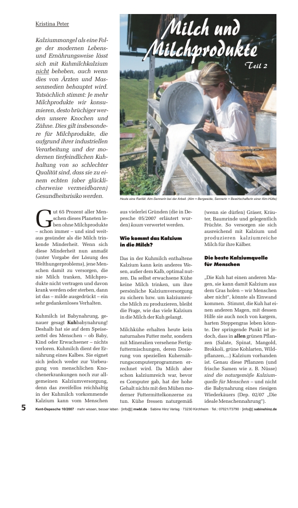 »Kalziummangel als eine Folge der modernen Lebens- und Ernährungsweise lässt sich mit Kuhmilchkalzium nicht beheben, auch wenn dies von Ärzten und Massenmedien behauptet wird. Tatsächlich stimmt: Je mehr Milchprodukte wir konsumieren, desto brüchiger werden unsere Knochen und Zähne. Dies gilt insbesondere für Milchprodukte, die aufgrund ihrer industriellen Verarbeitung und der modernen tierfeindlichen Kuhhaltung von so schlechter Qualität sind, dass sie zu einem echten (aber glücklicherweise vermeidbaren) Gesundheitsrisiko werden.«