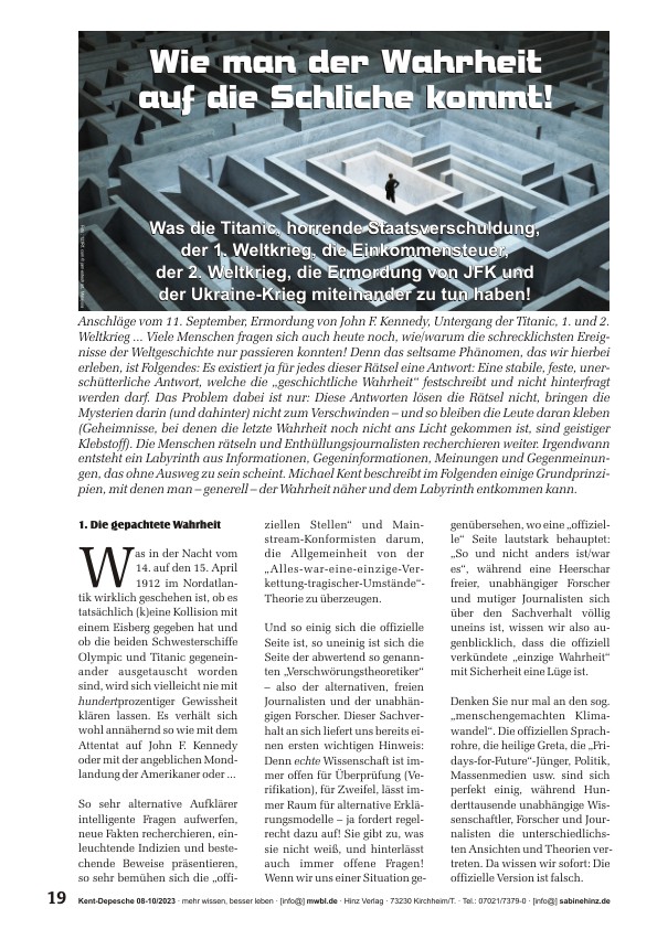 »9/11, Ermordung von John F. Kennedy, Untergang der Titanic, 1. und 2. Weltkrieg ... Viele Menschen fragen sich auch heute noch, wie/warum die schrecklichsten Ereignisse der Weltgeschichte passieren konnten! Denn das seltsame Phänomen dabei ist Folgendes: Es existiert für jedes dieser Rätsel eine Antwort, welche die „geschichtliche Wahrheit“ festschreibt und nicht hinterfragt werden darf. Das Problem dabei ist nur: Diese Antworten lösen die Rätsel nicht, bringen die Mysterien darin (und dahinter) nicht zum Verschwinden – so bleiben die Leute daran kleben und Enthüllungsjournalisten recherchieren weiter. Irgendwann entsteht ein Labyrinth aus Informationen, Gegeninformationen, Meinungen und Gegenmeinungen. In diesem Artikel beschreibt Michael Kent einige Grundprinzipien, mit denen man – generell – der Wahrheit näher und dem Labyrinth entkommen kann.«