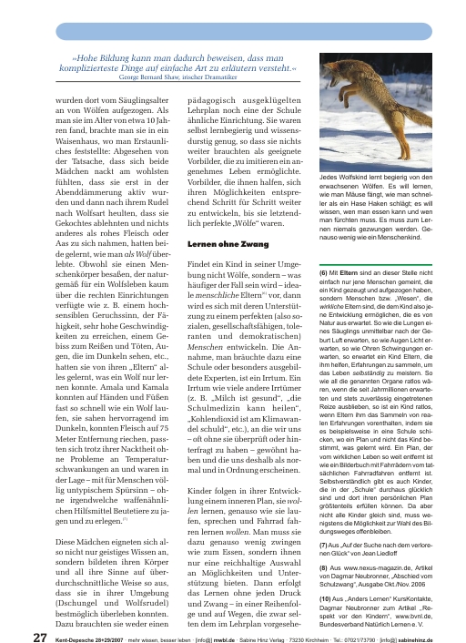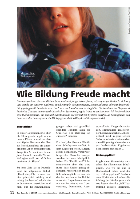 »Die heutige Form der staatlichen Schule nimmt junge, lebensfrohe, wissbegierige Kinder in sich auf und spuckt am anderen Ende viel zu oft stumpfe, desinteressierte, lebensunlustige oder gar drogenabhängige Jugendliche wieder aus. Doch was noch schlimmer ist: Es gibt im Deutschland der Gegenwart fast keine Chance, dem unterdrückerischen System auf legale Weise zu entkommen! Ich fordere daher eine Bildungsreform, die sämtliche Bestandteile des derzeitigen Systems betrifft: Die Schulpflicht, den Lehrplan, das Schulsystem, die Pädagogik und Didaktik (Ausbildungsmethode) …«