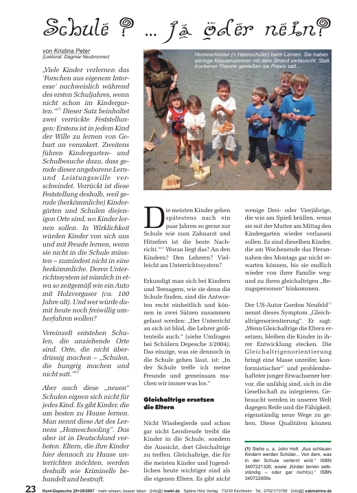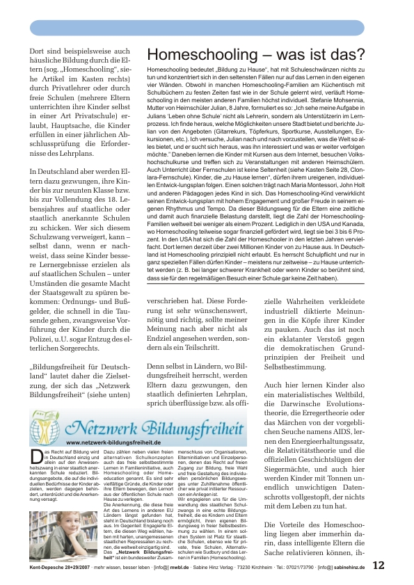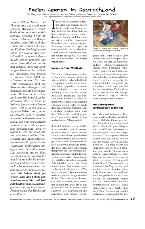 »Unsere Söhne Moritz und Thomas sind 1996 und 1999 geboren. Wir leben in Norddeutschland und sind selbstständig, arbeiten beide zu Hause und teilen uns Berufstätigkeit, Haushalt und das Leben und Lernen mit unseren Kindern. Moritz ging zwei Jahre zur Schule und war schließlich in seiner Lebensfreude, seinem Lerneifer und seiner Gesundheit so am Boden zerstört, dass wir nach langem Hin und Her und vielen Versuchen, eine Lösung zu finden, Ende 2005 beschlossen haben, für sein Wohl einzustehen und die Auseinandersetzungen mit den Behörden auf uns zu nehmen. Thomas hatte schon nach zwei Wochen Schule beschlossen, dass er lieber in Ruhe zu Hause weiter lernen wolle, weil er in der Schule Kopfweh bekam und „es da so schlecht riecht“. Seitdem leben die beiden in einem Zustand, den man fast Seligkeit nennen kann, sind den ganzen Tag emsig tätig – und wir staunen, was sie alles tun und wie sie sich anhand ihrer eigenen, aus ihnen selbst erwachsenden Projekte Wissen, Techniken, Erfahrungen aneignen und die Welt erobern. Das begeistert uns so, dass wir mittlerweile dankbar für den Mut und die Entschlossenheit sind, mit denen unsere Kinder sich geweigert haben, weiter zur Schule zu gehen. Wir haben nicht gewusst, dass das Leben von Kindern so schön und frei sein kann und dass Lernen eigentlich ein so organischer Prozess ist wie das Wachstum einer Pflanze.«