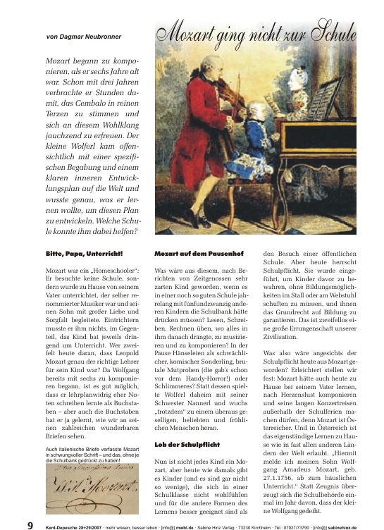 »Mozart begann zu komponieren, als er sechs Jahre alt war. Schon mit drei Jahren verbrachte er Stunden damit, das Cembalo in reinen Terzen zu stimmen und sich an diesem Wohlklang jauchzend zu erfreuen. Der kleine Wolferl kam offensichtlich mit einer spezifischen Begabung und einem klaren inneren Entwick-lungsplan auf die Welt und wusste genau, was er lernen wollte, um diesen Plan zu entwickeln. Welche Schule konnte ihm dabei helfen?«
