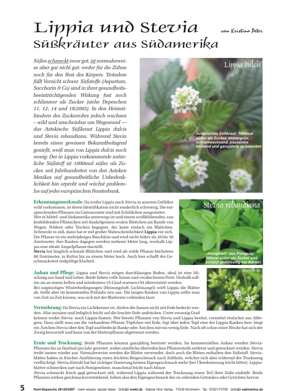 »Süßes schmeckt zwar gut, ist normalerweise aber gar nicht gut: weder für die Zähne noch für den Rest des Körpers. Trotzdem fällt Verzicht schwer. Süßstoffe (Aspartam, Saccharin & Co) sind in ihrer gesundheitsbeeinträchtigenden Wirkung fast noch schlimmer als Zucker. In den Heimatländern des Zuckerrohrs jedoch wachsen – wild und unscheinbar am Wegesrand –– das Aztekische Süßkraut Lippia dulcis und Stevia rebaudiana. Während Stevia bereits einen gewissen Bekanntheitsgrad genießt, weiß man von Lippia dulcis noch wenig: Der in Lippia vorkommende natürliche Süßstoff ist 1000mal süßer als Zucker, seit Jahrhunderten von den Azteken Mexikos auf gesundheitliche Unbedenklichkeit hin erprobt und wächst problemlos auf jeder europäischen Fensterbank.«